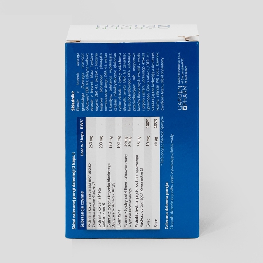 Склад: Екстракт кореня спаржі (Asparagus racemosus /Shatavari/) DER: 4:1; яловичий желатин; Екстракт кореня маки (Lepidium meyenii) ПЕД: 4:1; екстракт кореня астрагалу (Astragalus membranaceus Bunge) ПЕД: 4:1; L-карнітину тартрат; наповнювач: целюлоза мікрокристалічна; глюконат цинку; екстракт смоли ладану (Boswellia serrata) DER: 6:1 вміст босвелової кислоти: 60%; антизлежувач: магнієві солі жирних кислот, екстракт квітки шафрану та тичинки (Crocus sativus L.) ПЕД: 4:1; засіб проти злежування: діоксид кремнію; селеніт натрію; барвники: діоксид титану, діамантовий синій.