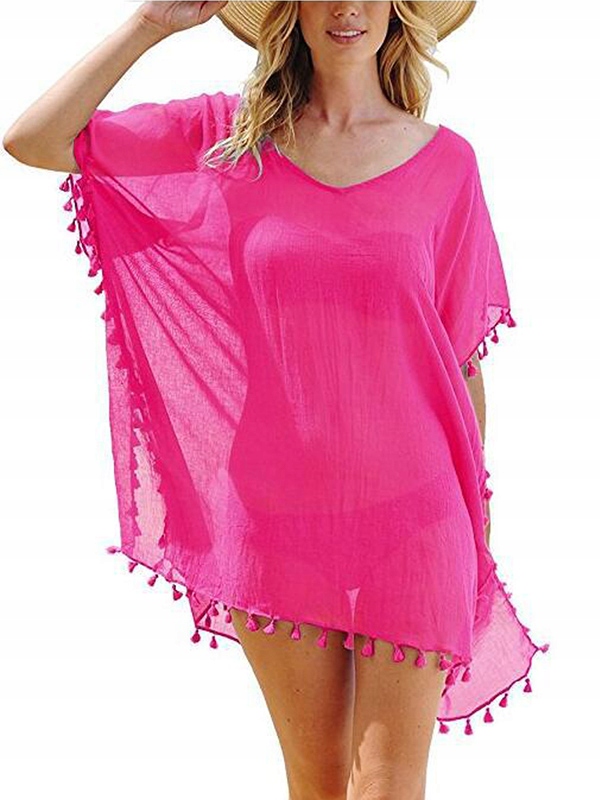ПЛЯЖНА ТУНІКА З СВІТЛОГО ШИФОНУ З ДЕКОРАТИВНОЮ БАХРОМОЮ