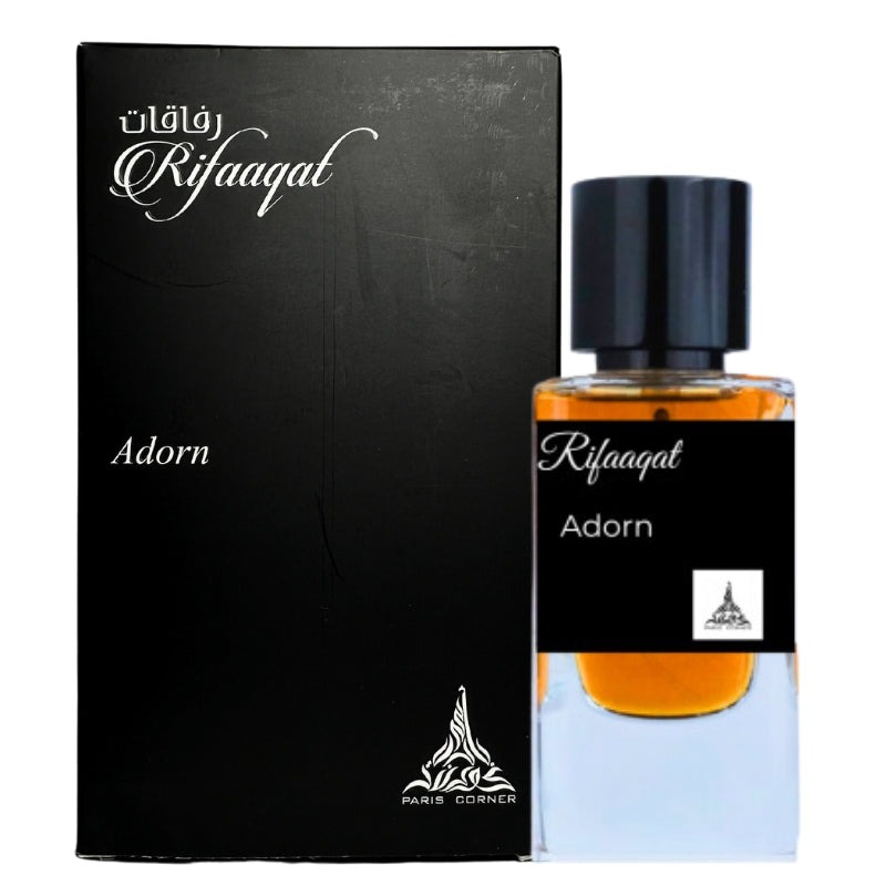 Базова нота амбри, ванілі, деревних тонів і бензоїну створює теплий і чуттєвий основа, що робить Rifaaqat Adorn добре округлим і тривалим ароматом, ідеальним для будь-якого випадку.