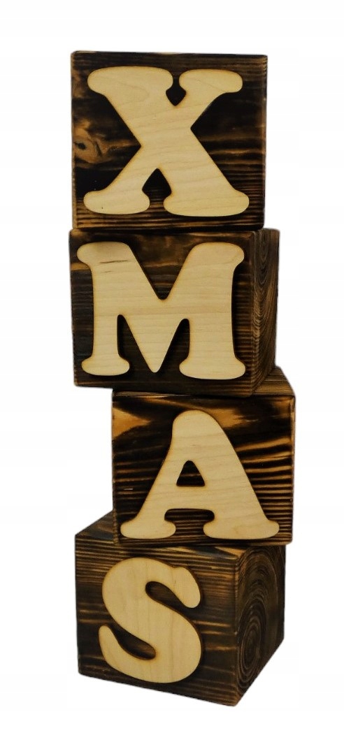 Чотири кубики з написом "XMAS", розміри 9,5x9,5x9,5 см кожен.