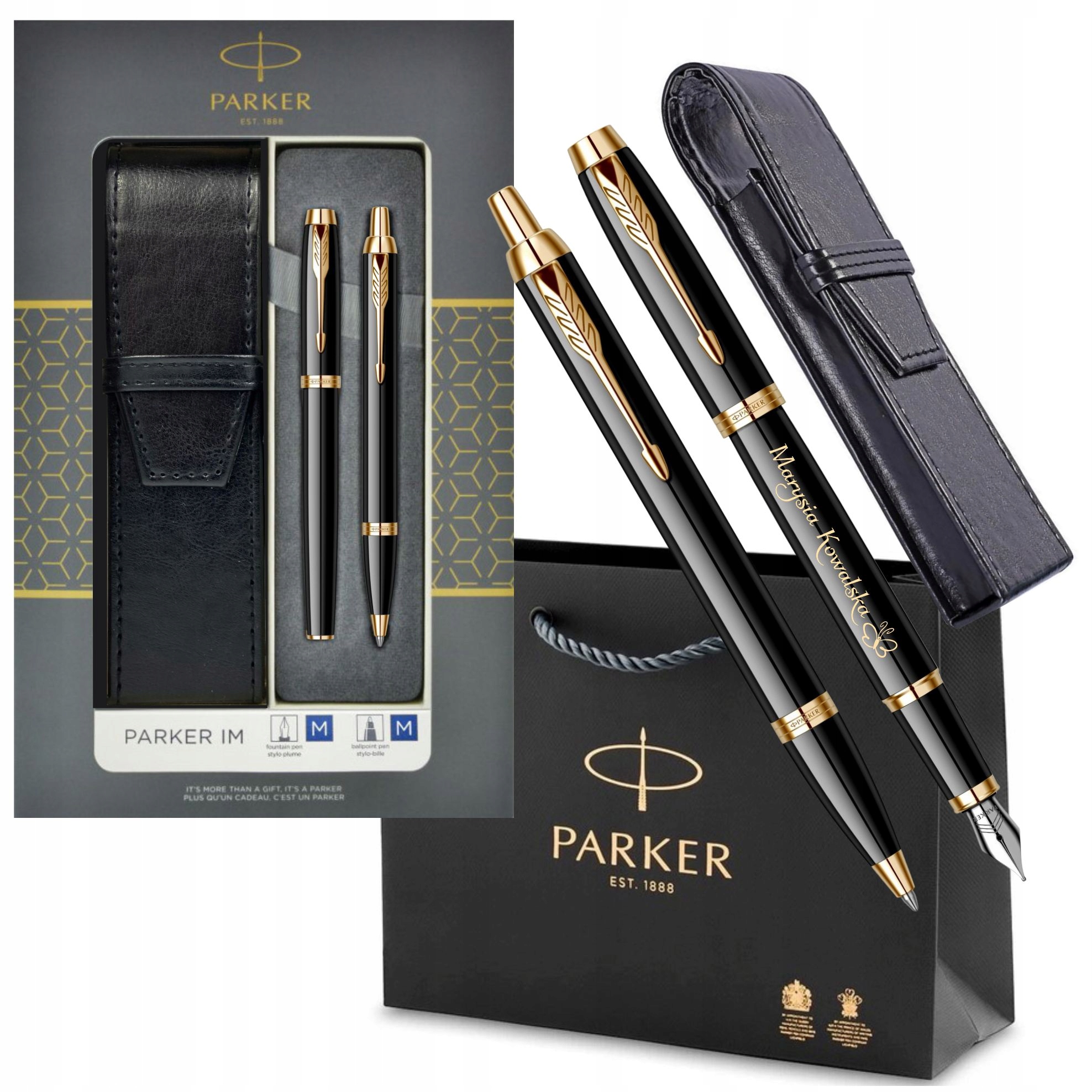 PARKER DŁUGOPIS I PIÓRO IM GT ZŁOCONE z GRAWEREM W PUDEŁKU I ETUI CZARNE