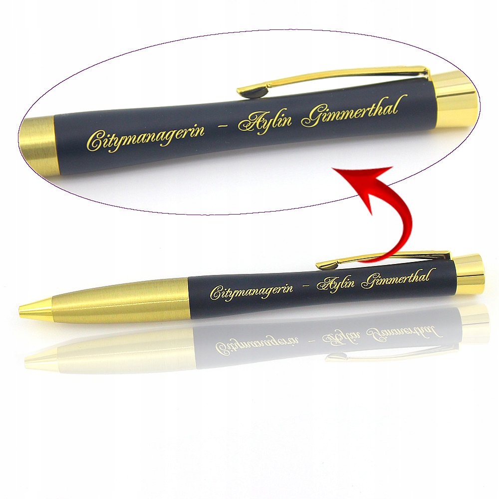 - Смачна ручка, яка поєднує в собі простоту чорного матового лаку з витонченою формою та красивою золотистою обробкою на кліпсі та передній частині частина. Оздоблення покрито 23-каратним золотом