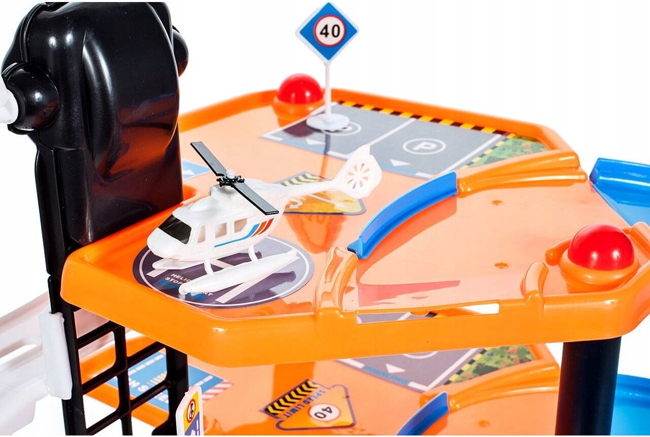4-поверхова парковка -це дуже весело для всіх маленький і великий любитель автомобілів і грати з гаражем. Набір, оснащений 5 транспортними засобами , включаючи 4 машини та білий вертоліт . На парковці є кривошипний елеватор , які автомобілі будуть перевезені до одного з чотирьох поверхів! На першому поверсі є автомобільна доріжка . У верхній частині є слайд , що веде підлогу внизу. Набір також включає набір дорожніх знаків .
