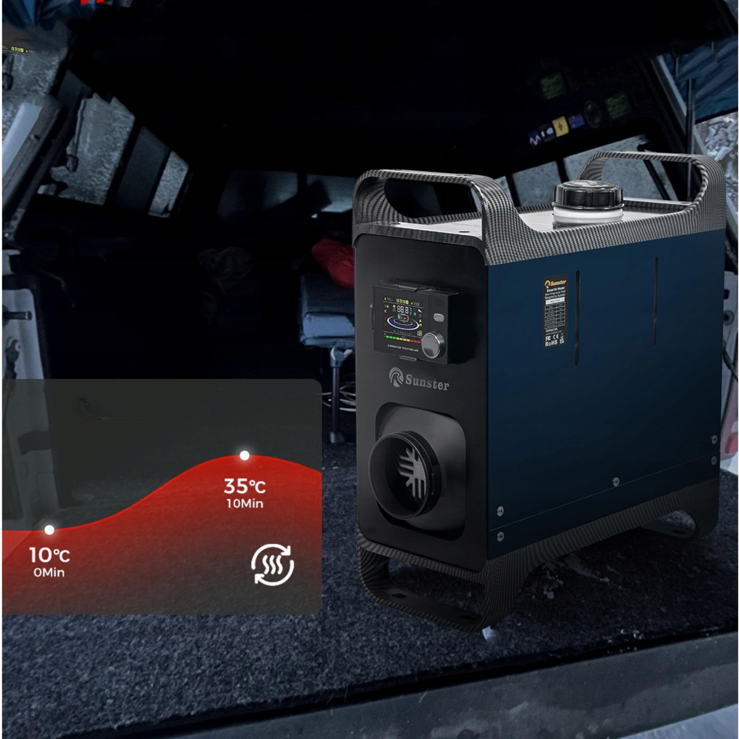 Алюмінієва камера згоряння рівномірно розподіляє тепло, гарантуючи тривалий термін служби. Це енергозберігаюче та комфортне рішення для цілорічного обігріву автомобіля чи приміщення.