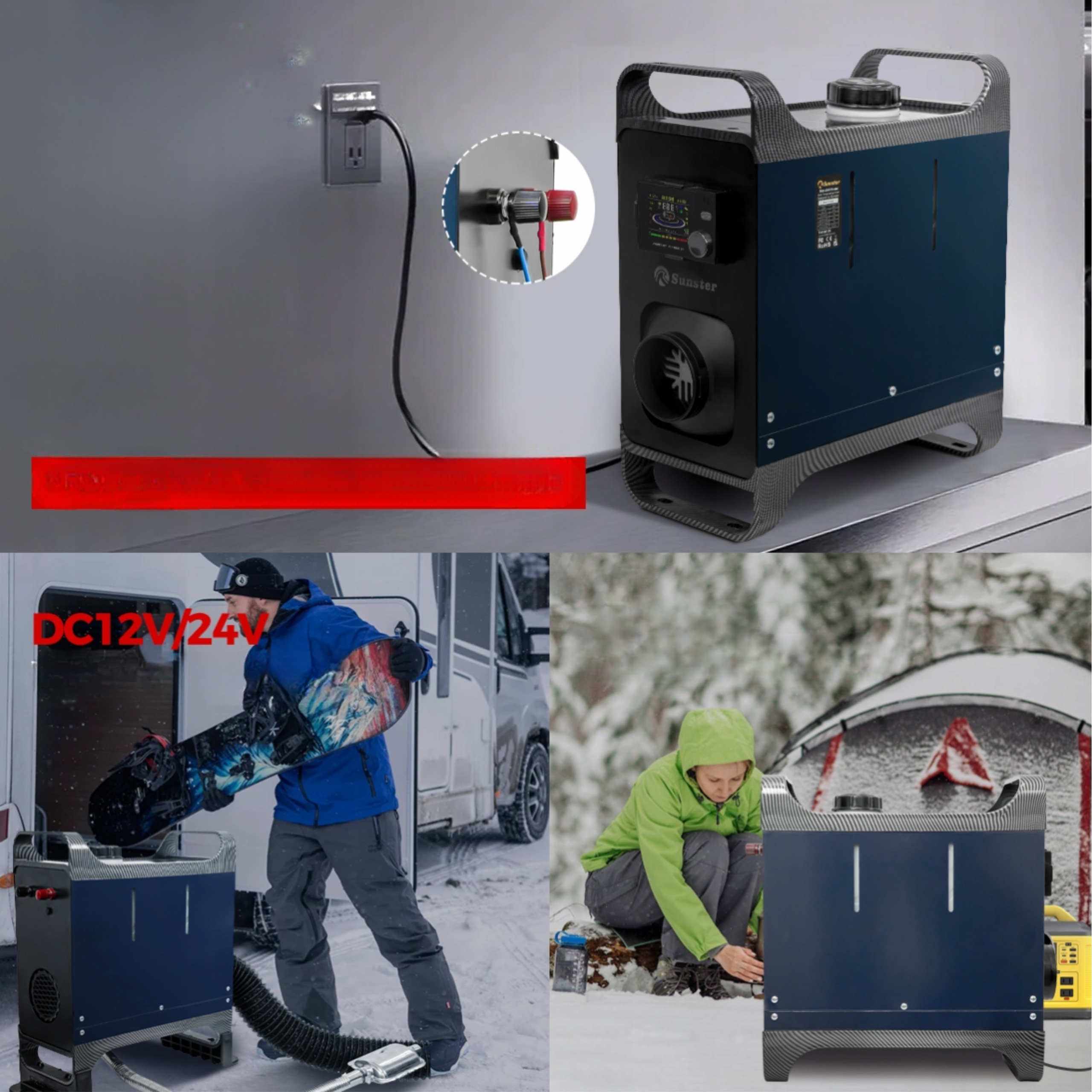 Ця модель обігрівача оснащена подвійною системою живлення, яка підтримує як постійний струм 12 В/24 В, так і змінний струм 110-240 В змінного струму.