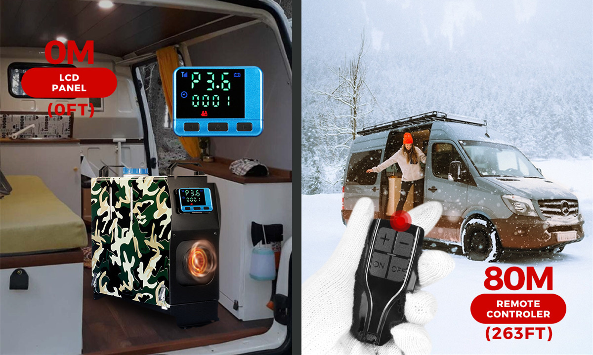 - Наш дизельний паркувальний обігрівач обладнано інтелектуальним РК-монітором і пультом дистанційного керування. Після ввімкнення таймер і термостат обігрівача можна регулювати автоматично або вручну за допомогою вбудованої РК-панелі. Крім того, ви можете дистанційно змінювати температуру, дозволяючи прогріти автомобіль перед входом у холодний ранок.