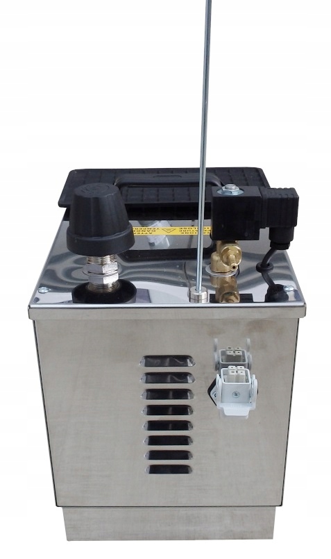 ◾ На передній панелі є вимикач праски та генератора, манометр, контрольні лампочки, що інформують про готовність машини до роботи та індикатор кількості води в бойлері. Крім того, він оснащений зовнішньою розеткою з підключенням до джерела живлення та управління парогенератором.