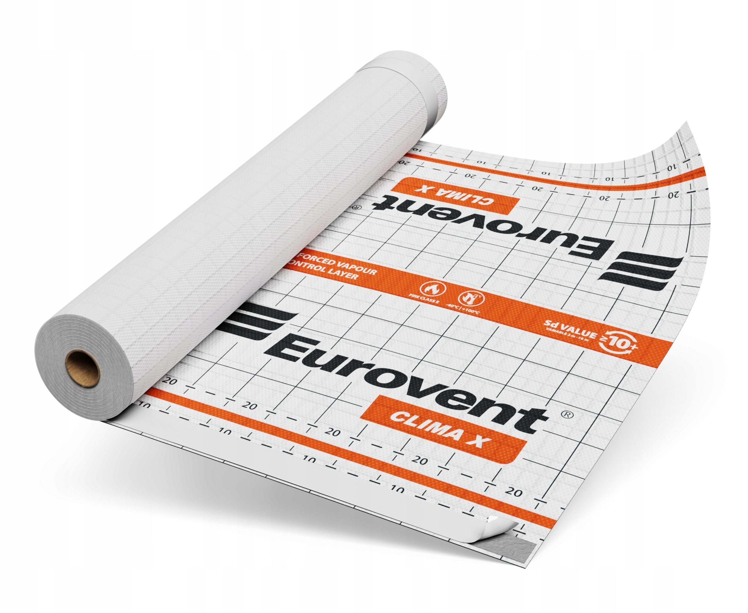 Активна пароізоляційна мембрана Eurovent® CLIMA X, три -шар, армований сіткою ПЕ, має змінний рівень коефіцієнта Sd. Виготовлений із шару поліпропіленового флізеліну, спеціальної функціональної плівки та поліетиленової сітки. Функціональна плівка дозволяє невеликій кількості водяної пари мігрувати до горища зсередини будівлі та, якщо необхідно, з горища всередину, завдяки чому продукт має т.зв. пароізоляційна активність. Можливе виготовлення під замовлення у варіанті з двома самоклеючими стрічками - SYSTEM SK2.