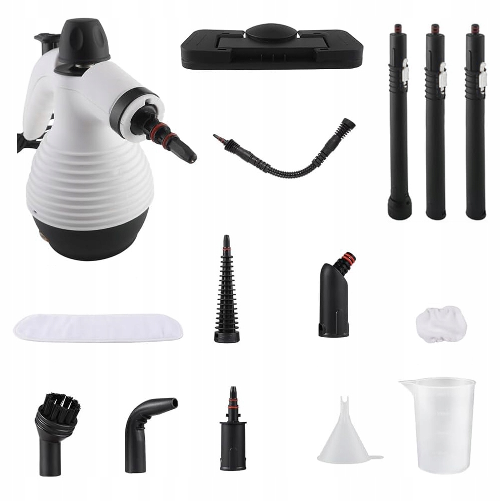 Містить 15 спеціалізованих аксесуарів: плоский скребок (для миття вікон), щітка (для чищення поверхонь), вигнута та пряма насадка (для чищення щілин), подушечка з мікрофібри (для догляду за підлогою) та багато іншого.