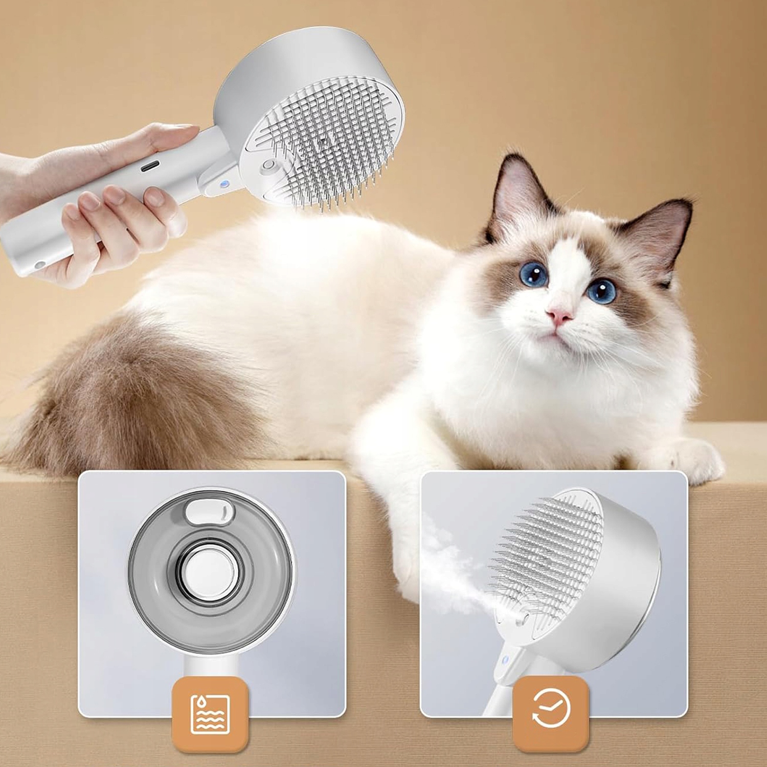 Ця щітка для котів із функцією відпарювання ефективно видаляє пухку шерсть і клубки, забезпечуючи розслаблюючий масаж і догляд. Функція відпарювання допомагає контролювати линьку та зменшує статичну електрику, зберігаючи шерсть вашого вихованця гладкою та чистою. 🐱🦠🐶