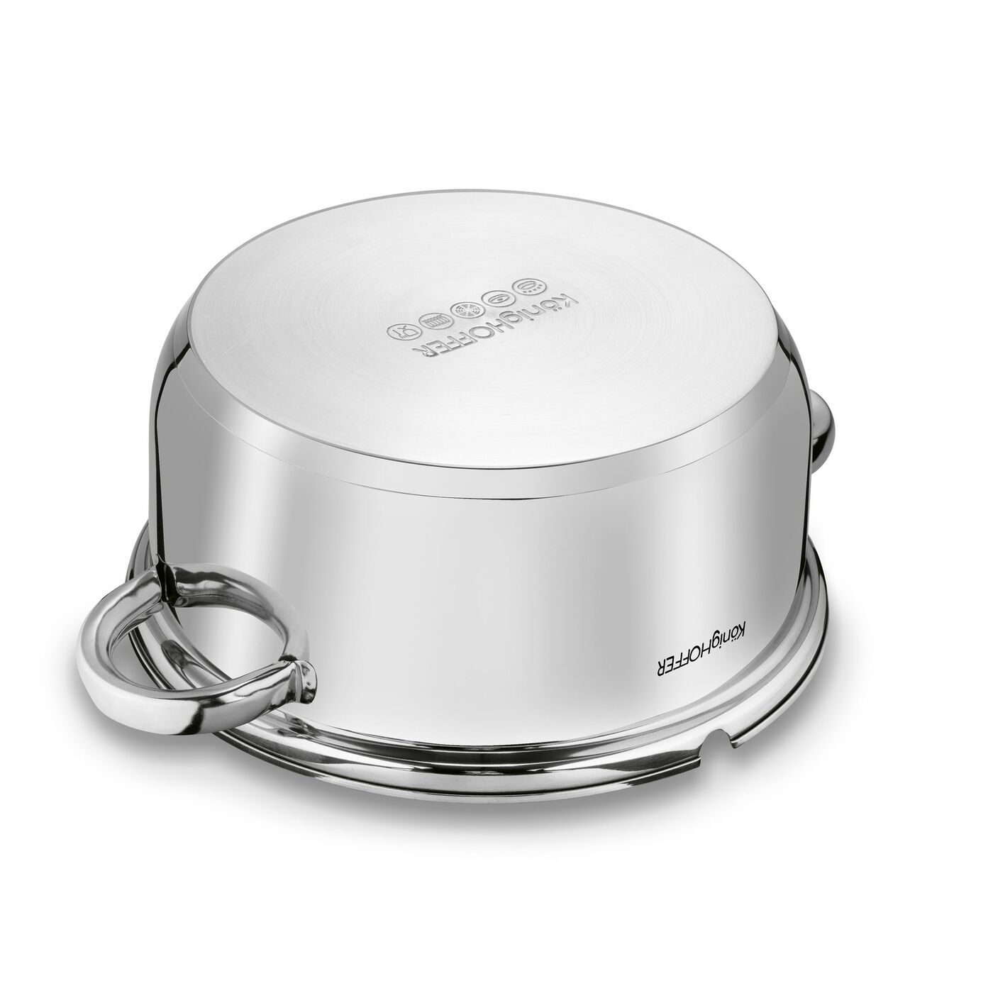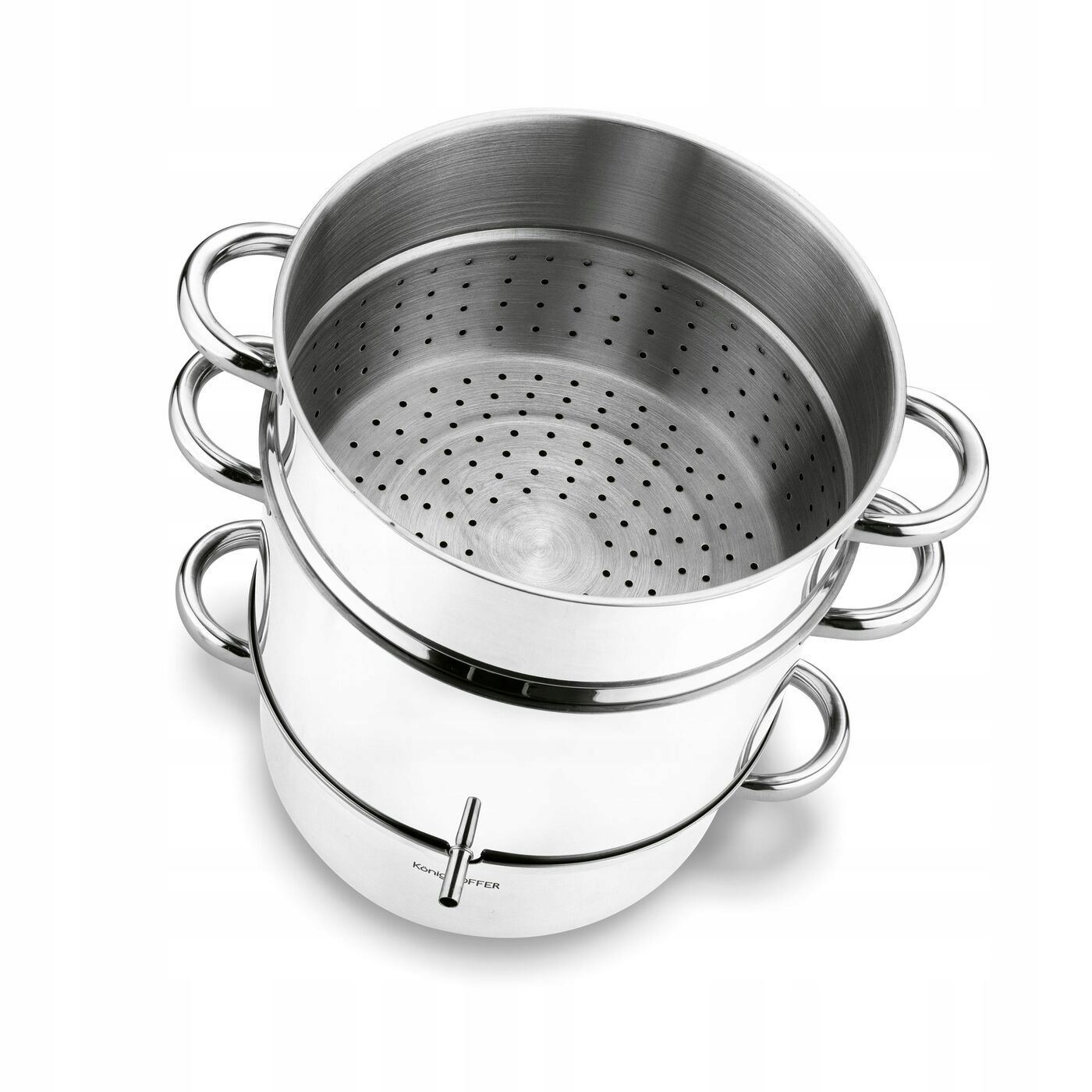 Парова соковижималка Konighoffer 5 л виготовлена з нержавіючої сталі. У виробі використовується конструкція, що складається з кількох частин. Завдяки цьому ви можете легко підтримувати його в чистоті. Також легше знайти місце для його зберігання. Ця надійна соковижималка залишиться з вами протягом багатьох фруктових сезонів. З ним ви перетворите свої улюблені фрукти на смачні натуральні соки. Це ще не все, адже ви отримаєте та збережете весь аромат, смак та вітамінний потенціал використаних фруктів. Більше того, ви можете наповнювати підготовлені пляшки прямо з соковижималки, оскільки продукт має спеціальну трубку для розливу есенції з стоячої моделі. Щоб зупинити спорожнення, просто затисніть на шлангу металеву скобу, що входить до комплекту. М’якоть, що залишилася, можна використовувати для приготування домашньої консервації, наприклад, варення. Дно виробу є акумулятивним, енергозберігаючим і забезпечує швидке та рівномірне нагрівання. Це також означає, що ви можете використовувати соковижималку на будь-якій плиті, навіть на індукційній плиті. У набір також входить 3 флакона для настоянок. Не менш гарні вони і для соків. Їх ємність 500 мл, 350 мл і 250 мл (по одному в кожному розмірі). Металеві ковпачки забезпечують їх герметичність.
