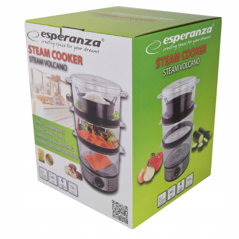 Пароварка Esperanza STEAM VOLCANO - незамінний прилад на кожній кухні. Дозволяє швидко приготувати навіть кілька страв одночасно, зберігаючи їх природний запах і смак. У порівнянні зі стравами, приготованими на воді, страви на пару зберігають вітаміни і корисні речовини, що робить їх більш цінними і корисними. Три ємності великої місткості дозволяють готувати кілька різних страв одночасно. Вбудований таймер зворотного відліку полегшує процес приготування. Завдяки простій конструкції пароваркою дуже легко керувати та чистити її. Страви, приготовані на пару, рекомендовані дієтологами. Особливо вони важливі для людей з проблемами травної системи та всіх, хто стежить за своєю фігурою.