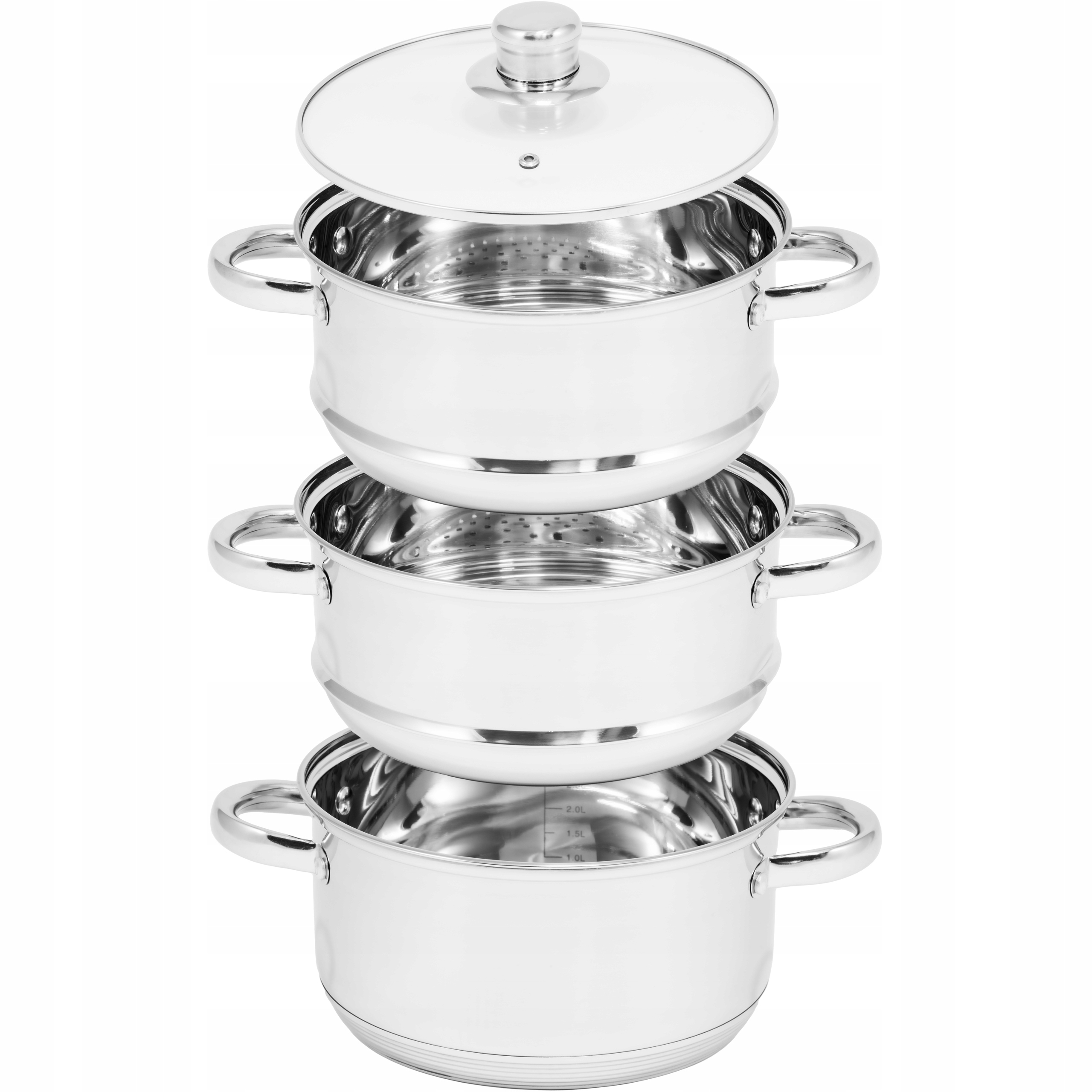 Парова набір виготовлена з високоякісної нержавіючої сталі, завдяки чому характеризується підвищеною стійкістю до корозії, механічних пошкодження та вплив навколишнього середовища висока температура. Сталь абсолютно безпечна для здоров'я і нейтральна до їжі, не реагує з їжею і не затримує бруд і домішки, тому вона дуже гігієнічний і легко чиститься.