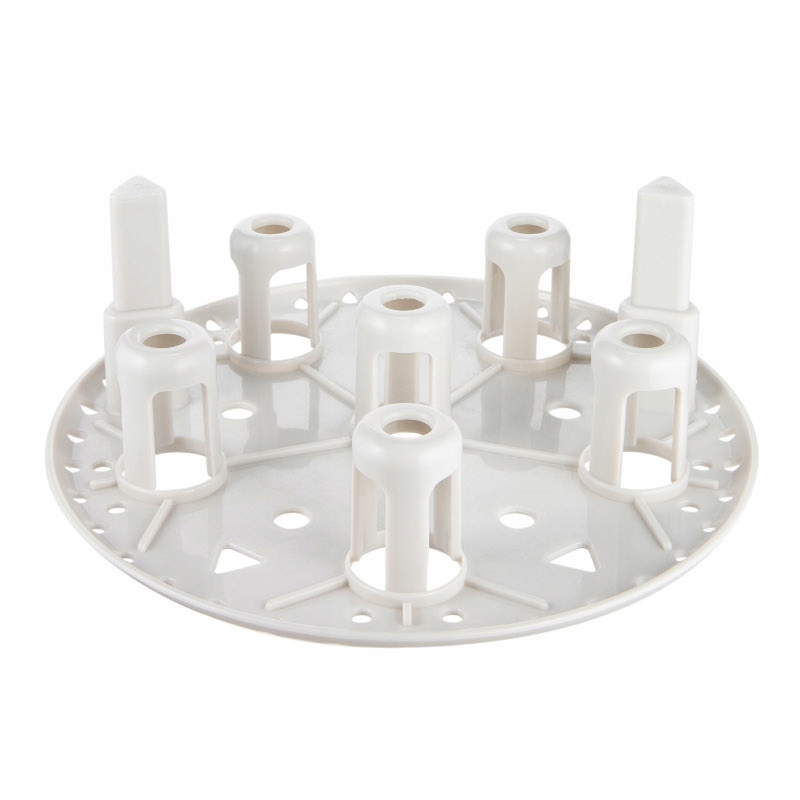 Виконайте першу стерилізацію «порожнім», щоб продезінфікувати його внутрішню частину. Налийте 75 мл води на плиту. Встановіть базовий кошик, а потім стабілізатор пляшки на вал конструкції так, щоб горлечка цих елементів стикалися. Розміщуючи предмети для дезінфекції, переконайтеся, що пара може ефективно циркулювати по всіх поверхнях і що конденсована вода може легко стікати в контейнер фільтра. Поставте пляшки на конструкцію догори дном, пропустивши їх крізь стабілізатор пляшок і помістивши на виступи базового кошика. Потім поставте кошик на ніжку й зафіксуйте його, а потім покладіть у нього всі аксесуари. Помістіть цю зібрану конструкцію в корпус стерилізатора і надіньте кришку. Підключіть пристрій до розетки та натисніть кнопку живлення. Не піднімайте кришку під час роботи пристрою. Після завершення стерилізатор автоматично вимкнеться. Ви почуєте звуковий сигнал 5 разів про те, що процес завершено; контрольний діод погасне. Щоб видалити продезінфіковані елементи, дочекайтеся, поки стерилізатор охолоне. Воно має охолонути мінімум 3 хвилини. Від'єднайте кабель живлення та зніміть кришку. Вміст стерилізатора залишатиметься стерильним протягом 6 годин після завершення процесу, якщо не знімати кришку. Вилучені предмети слід використовувати/зібрати одразу після завершення процесу або повторно стерилізувати. Після використання приладу та демонтажу елементів відкрутіть захист контейнера фільтра, вийміть контейнер фільтра, злийте воду, що залишилася після дезінфекції, і промийте контейнер. Нарешті, протріть внутрішню частину корпусу та контейнера тканиною, щоб запобігти появі накипу чи осаду.
