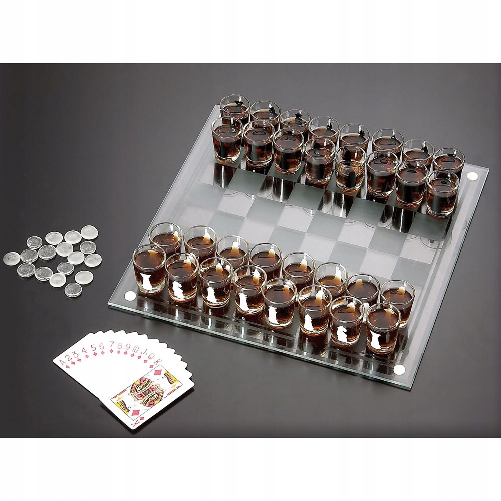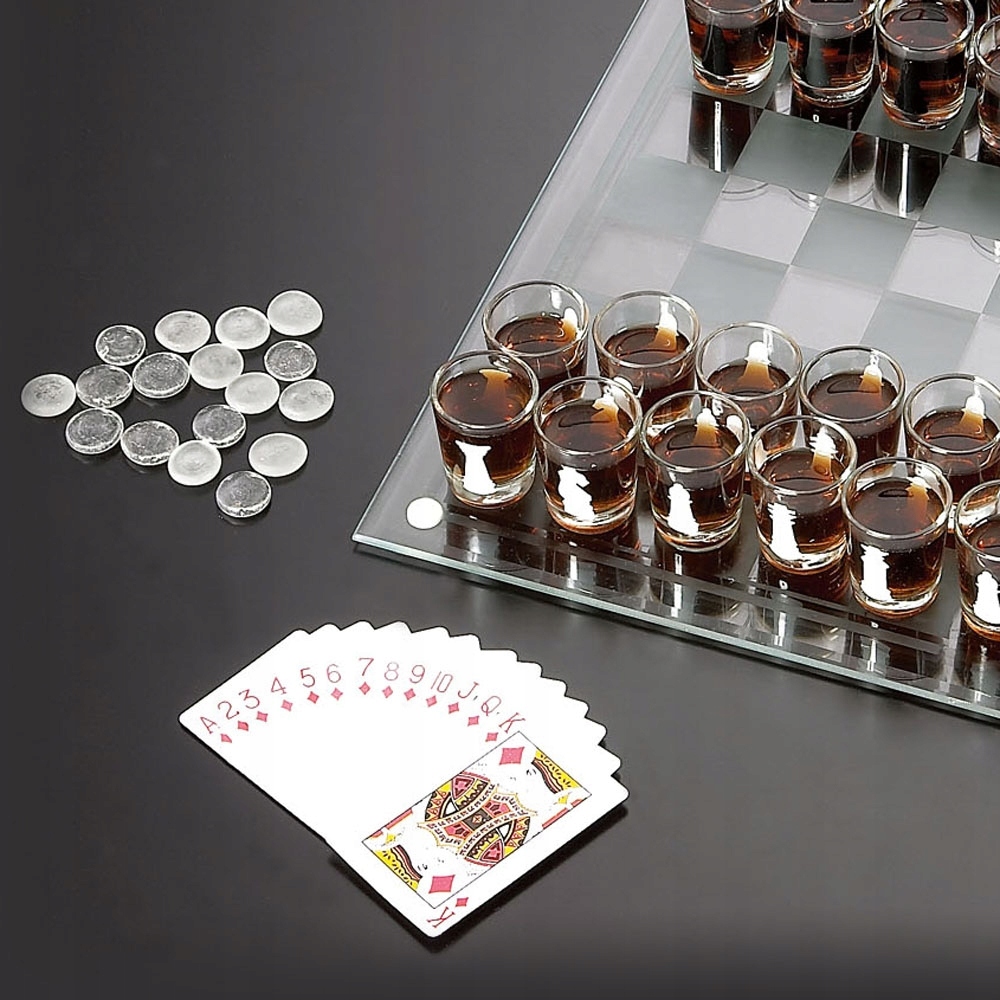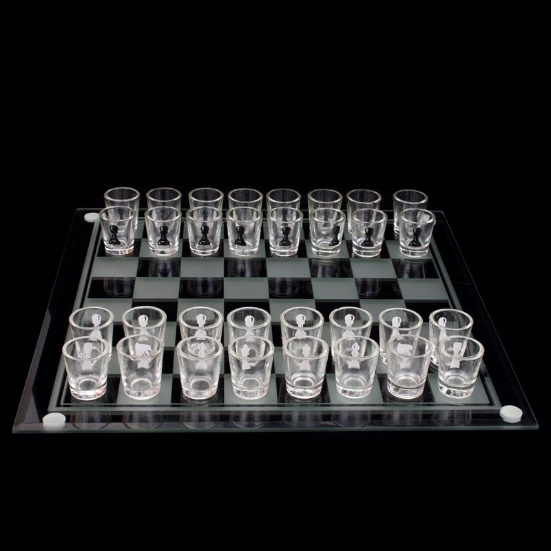 Шаховий набір із склянками замість фігур і аксесуарів.