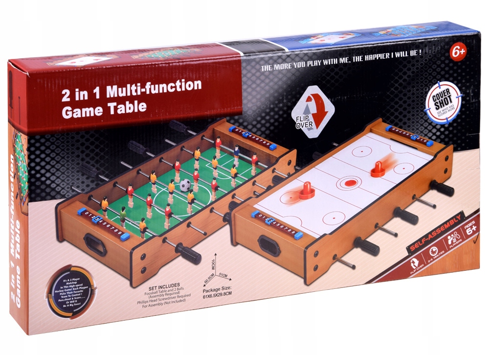 Набір для настільного футболу 2 в 1 - це пропозиція для кожного, щоб провести свій вільний час. Стіл виготовлений дуже ретельно та професійно, приділяючи увагу найдрібнішим деталям. На полі для настільного футболу намальовані лінії, а з іншого боку дошки – поле для аерохокею. Ігрові дошки виготовлені дуже акуратно і акуратно (жорсткий МДФ). Столи самозбірні.