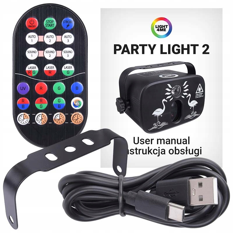 Великою перевагою Light4Me Party Light 2 є можливість дистанційного керування за допомогою бездротового інфрачервоного пульта дистанційного керування. Завдяки цьому ми можемо легко керувати мультиефектом, навіть якщо він знаходиться у важкодоступних місцях. ✅ Дистанційне керування дозволяє вмикати та вимикати пристрій, перемикатися між автоматичним та звуковим режимами, керувати лазерами і змішування кольорів, створювати стробоскопічні ефекти, а також програмувати Party Light так, щоб пристрій само вимкнувся після встановленого часу (функція Таймер).