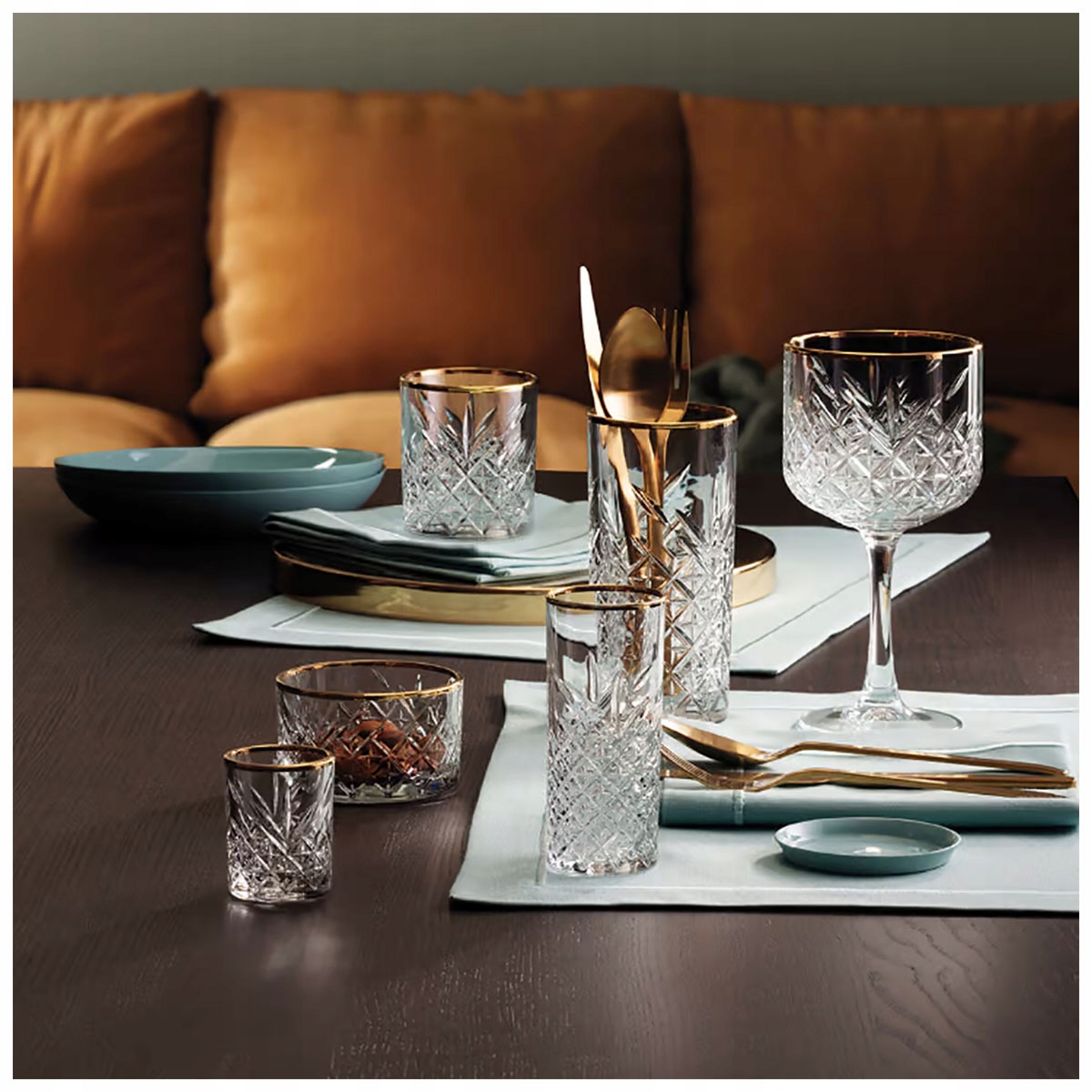 Стильний набір окулярів для коктейлів в 500 мл від позачасової колекції золота має прикраси у вигляді вирізаного скла, моделюючи на кристалах та золотий край. Дивовижна форма скла вражає своєю ергономікою. Окуляри, крім подачі шампанського, можна використовувати для поданих десертів. Власники професійної гастрономії охоче досягають елементів колекції позачасових, оскільки багато стилів домовленостей добре підходять.