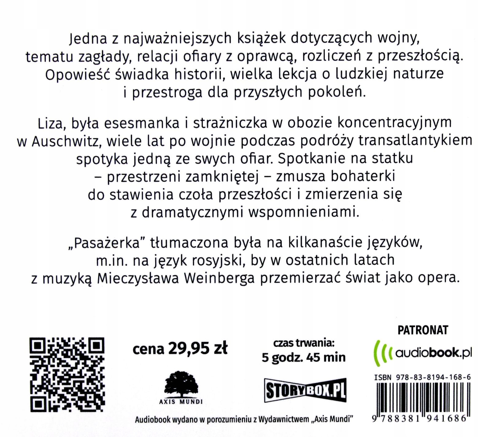 Одна з найважливіших книг про війну, тему винищення, стосунки між жертвою та злочинцем, зведення рахунків з минулим. Історія від свідка історії, великий урок про людську природу та застереження для майбутніх поколінь. Ліза, колишній офіцер СС і охоронець концентраційного табору Аушвіц, зустрічає одну зі своїх жертв під час трансатлантичної подорожі через багато років після війни. Зустріч на кораблі - замкнутому просторі - змушує героїнь зіткнутися з минулим і розібратися з драматичними спогадами. «Пасажир» перекладено кількома мовами, зокрема: на російську мову, а останніми роками подорожує світом як опера з музикою Мєчислава Вайнберга.