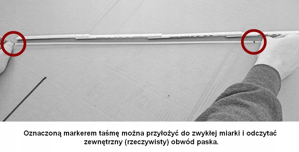 На фотографіях показано, як виміряти зовнішню (фактичну) окружність пояса.