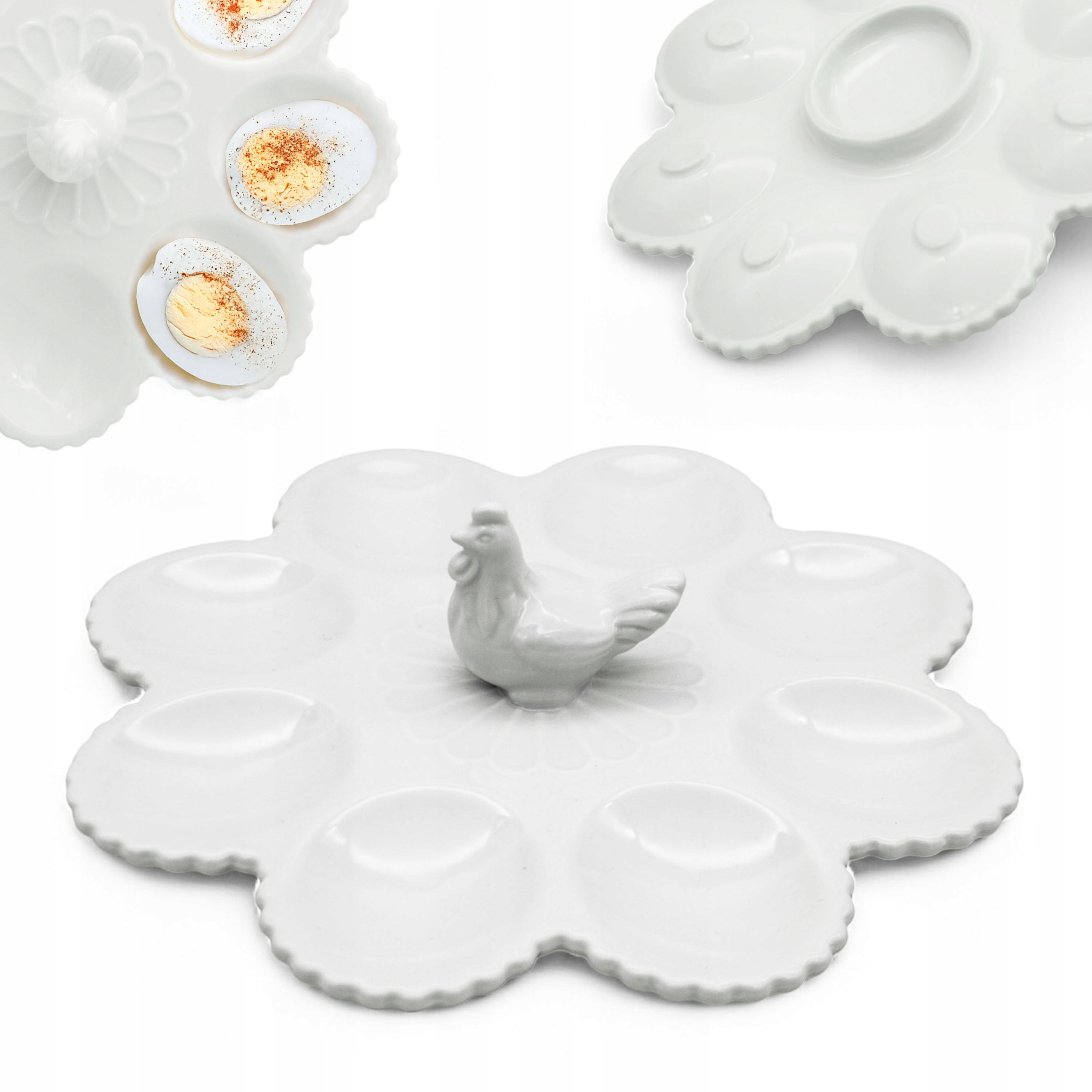Яйцева - практична і естетична посудина, призначена для подачі варених яєць, як круто, так і фаршированих. Його плоска форма з поглибленнями забезпечує стійке розміщення яєць, що полегшує їх подачу та запобігає їх переміщенню. У центрі тарілки розташована курка, яка є декоративним елементом, який надає страві шарму. Вона виготовлена з порцеляни, що робить її міцною та легкою для чищення. b> Завдяки своєму елегантному дизайну та унікальному декору тарілка ідеально підходить для таких святкувань, як Великдень або сімейні вечері.