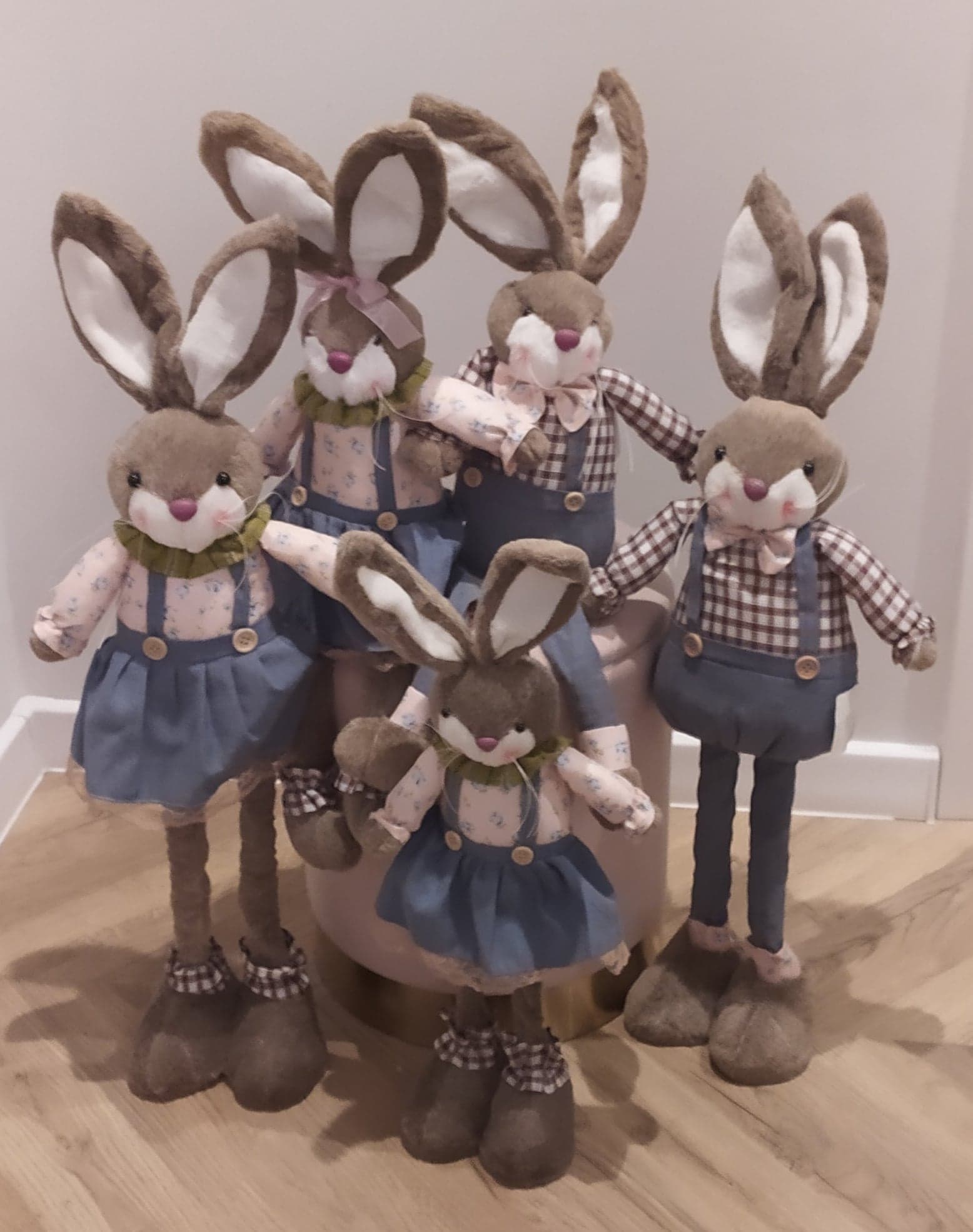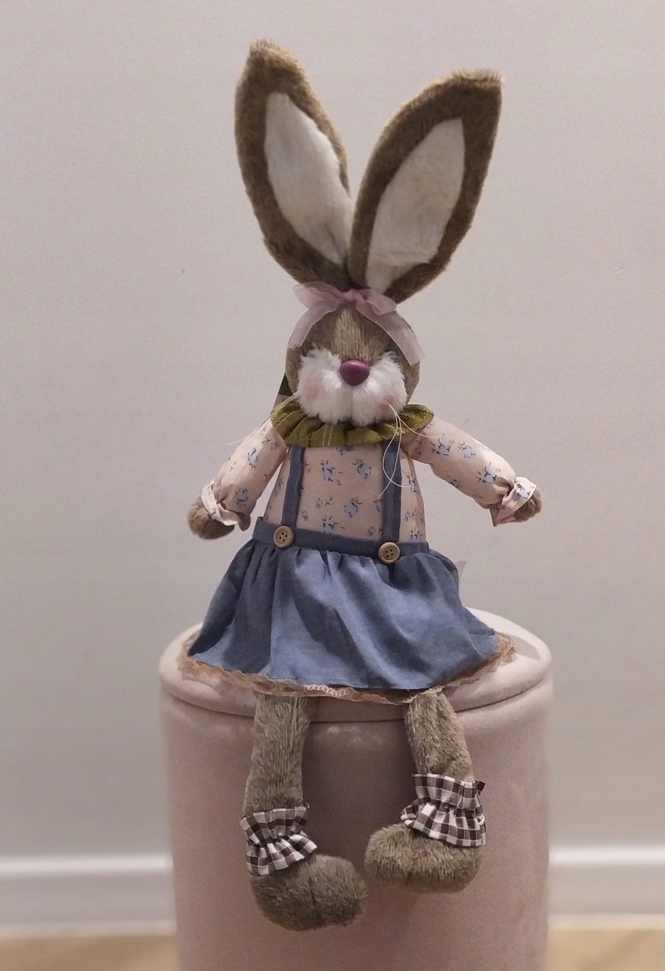 Зайчик має костюм із джутової тканини, рухомі вушка та звисаючі ніжки, щоб ви могли його посадити шафа або консоль.