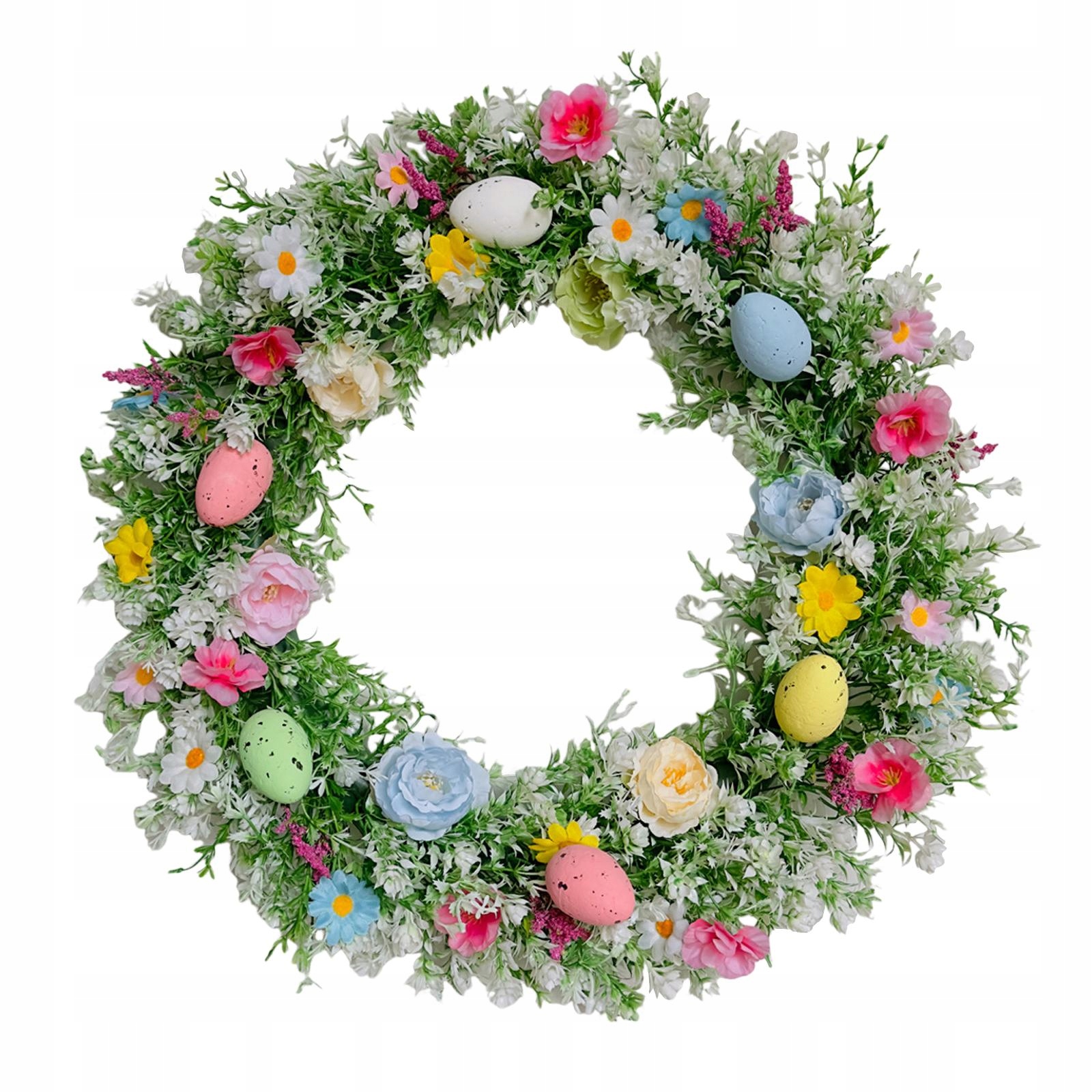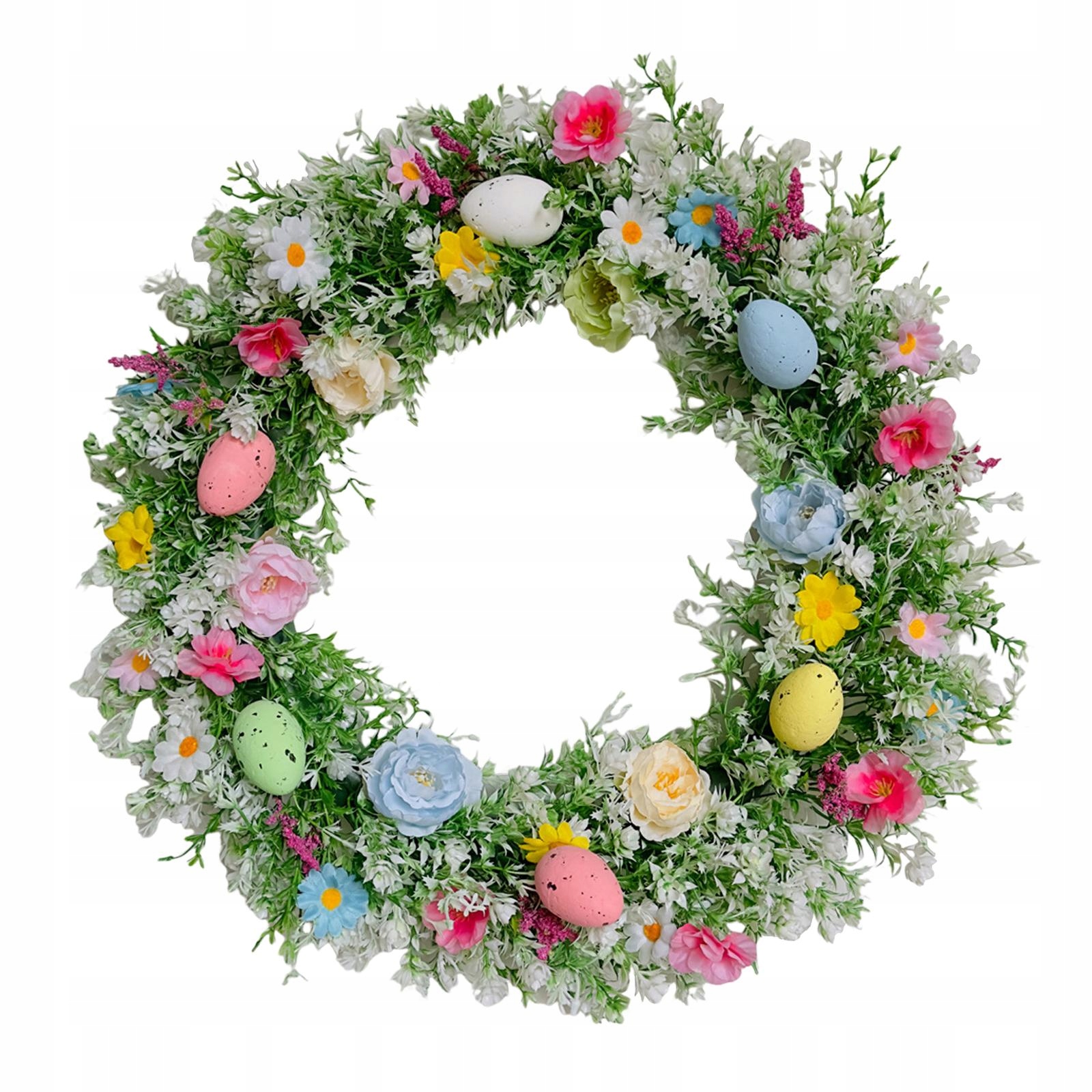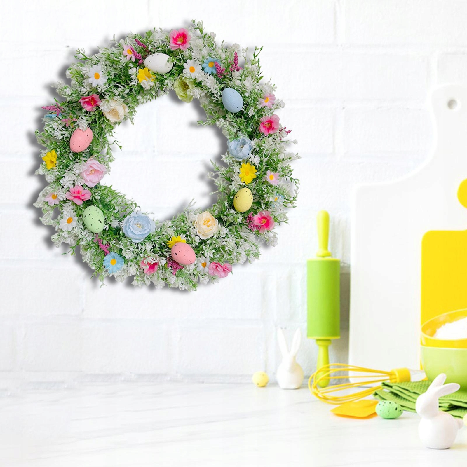 [Прекрасний великодній вінок]: Дотворений штучними квітами, зеленими листям та пасхальними яйцями, висілим у видимій місцем на вхідних дверях змусить відвідувача відчути подих весни. Міцний, м'який і легкий. Живий і реалістичний дизайн змушує будинок кинути життям протягом року. Примітка: Завдяки транспортним вимогам прикраса вінків загострюється, будь ласка, адаптуйте квіти та листя, щоб отримати їх фактичні розміри. Нагода.