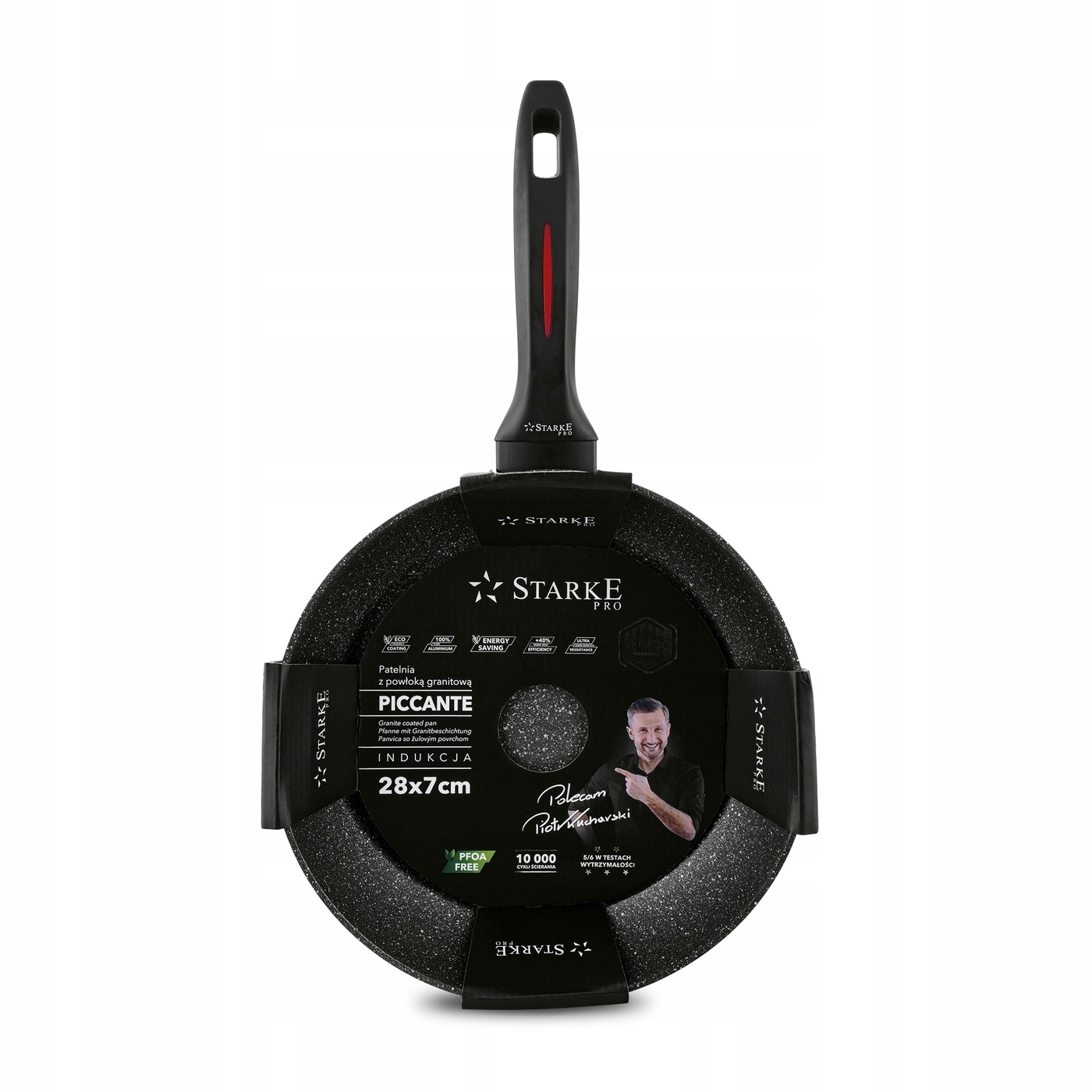 starka pro piccante granite, що не містить граніту, граніту, може використовуватися на індукції та газі, керамічних та електричних печах. Її тіло було гаряче від сертифікованого алюмінію. Завдяки цьому він добре збалансований, важкий і має суцільні стіни. Він також має значно більшу міцність до високої температури та пошкодження. Використовуване кам'яне антипригарне покриття було збагачено гранітними частинками. Він також товщі, ніж стандартні 3-шарніші покриття для запобігання адгезії та спалювання інгредієнтів. Його сила досягає 10 000 циклів стирання - один з кращих результатів у глобальному масштабі. Захист від опіків рук забезпечується м'якою сенсорною ручкою, яка не піднімає і не здійснює. Модель рекомендує Піор Кучерський, який особисто перевіряв його можливості та дав їм високий рейтинг. Ви будете смажити те, що хочете, на невеликій кількості вершкового масла або оливкової олії. Ви працюєте комфортно і миєте продукт. Сучасний дизайн мармурової глибокої гранітної сковороди зі смаком збагачував вашу кухню - це простий спосіб комфортного харчування та легко засвоюваних страв.