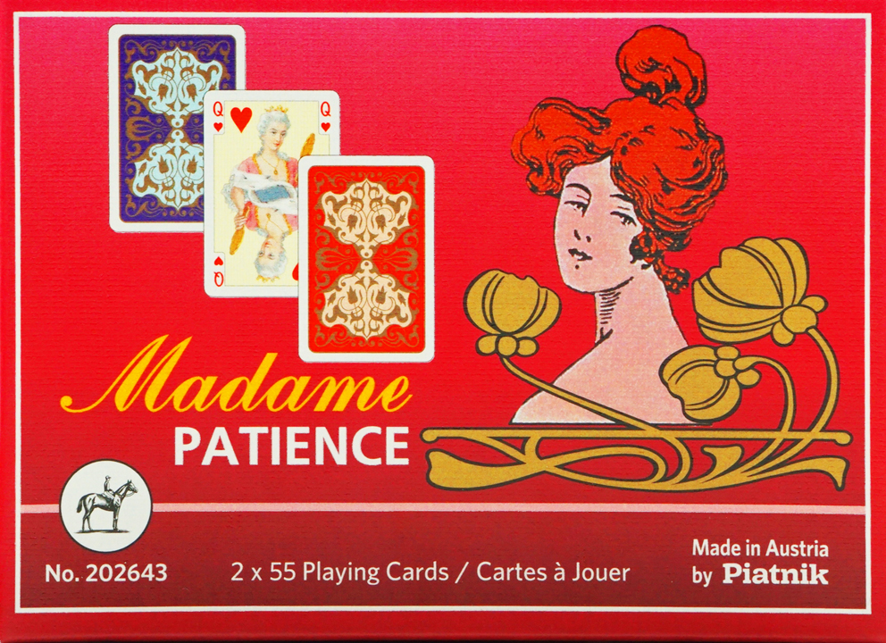 Пасьянси найвищої якості від відомої компанії Ferd. Piatnik & Sohne. Елегантна коробка містить 2 невеликі колоди. На реверсах (сорочках) є декорований орнамент. Менший формат полегшує розкладання пасьянсів. Колоди складаються з 55 пластикових карток розміром 44 х 66 мм і вагою 310.