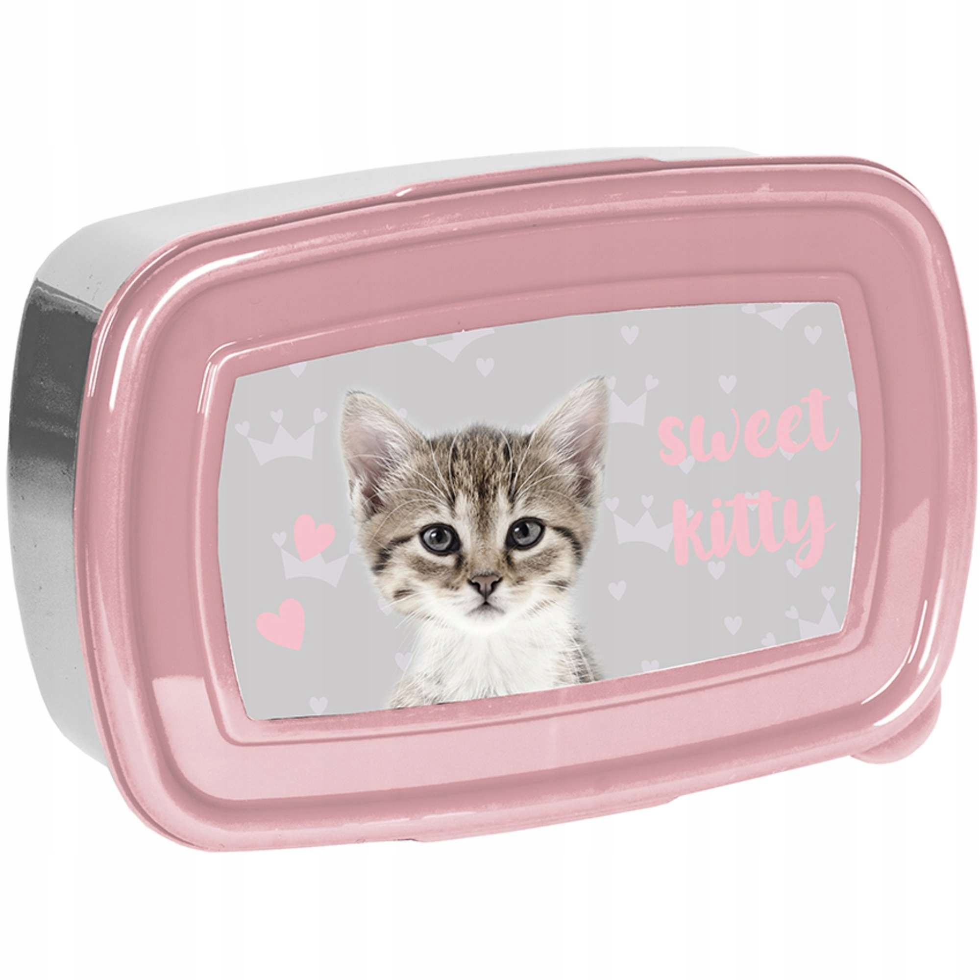 Śniadaniówka – це сіро-рожевий і має зображення кошеня та напис "sweet kitty".