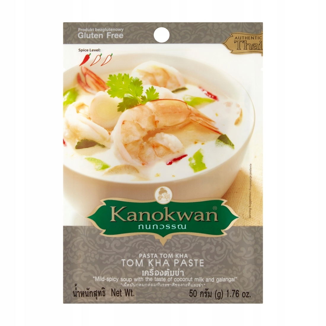 Tom kha — кокосовий, зігріваючий тайський суп із чудовим м’яким смаком. З помітним додаванням лемонграсу та кафру. Надзвичайно популярний у всій Азії. Нині вона завойовує країни Заходу. Паста Kanokwan містить композицію спецій, приготовлену за традиційним рецептом, укладену в зручний пакетик. Завдяки цьому ви легко приготуєте смачну тайську страву за 15 хвилин.