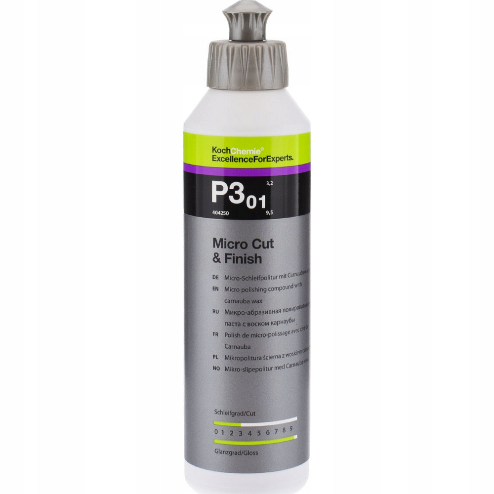 KOCH-CHEMIE Micro Cut & Finish полірувальна паста останнього покоління машинних мікро- полірування. полірування, призначене для остаточного видалення смуг, голограм, дрібних подряпин і слідів після матування середовищем P3000 з усіх систем фарбування (включаючи стійкі до подряпин), забезпечуючи при цьому довгострокову герметизацію з високим ступенем блиску та гладкістю.