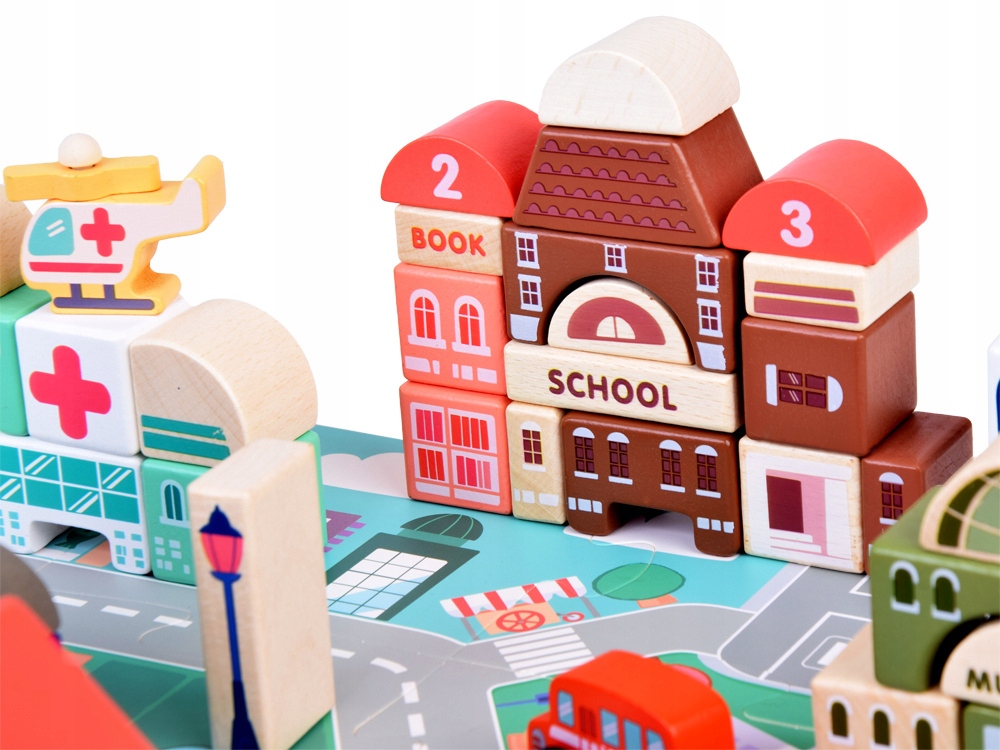 Перш ніж грати з кубиками, варто скласти пазл із зображенням міста. На комплексній дошці є призначені місця, де ви можете будувати свої будівлі та вулиці, де ви можете керувати своїми транспортними засобами; дорожні знаки для уроків водіння; а також рослинність, яка прикрашає і доповнює образ.