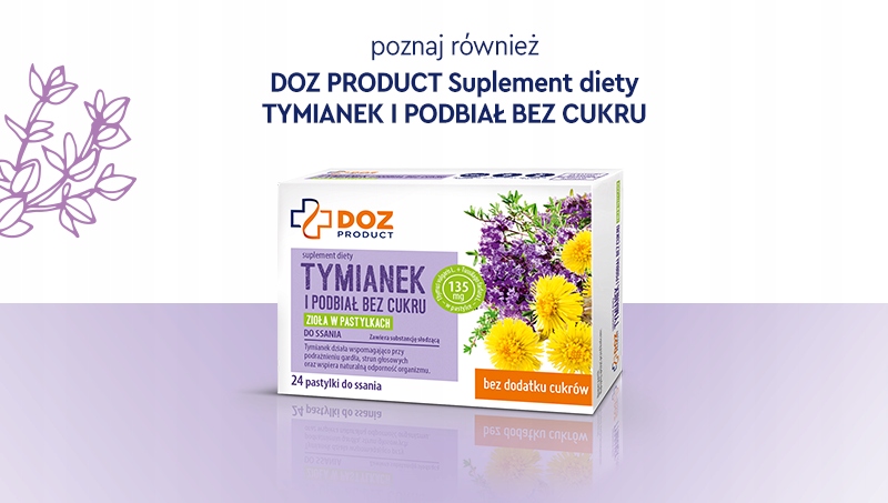 Пастилки з чебрецю та мати-й-мачухи DOZ - це дієтична добавка, що містить екстракти трав, які підтримують правильну роботу горла, гортані та голосових зв'язок. Чебрець допомагає заспокоїти подразнення, а мати-й-мачуха благотворно впливає на слизову оболонку ротової порожнини та горла. Регулярне вживання льодяників сприяє комфортному диханню та приносить полегшення від сухості в горлі та напруги в голосі. Продукт у формі таблеток зручно використовувати в будь-якій ситуації - на роботі, навчанні чи подорожі.