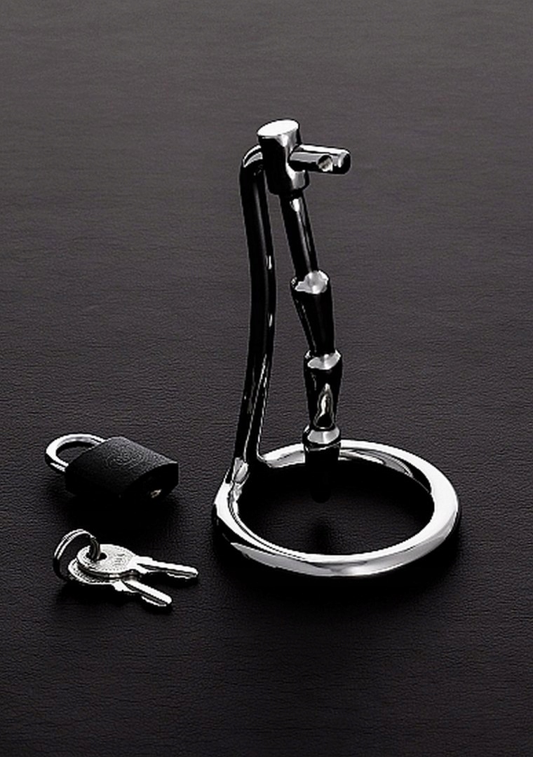 Виготовлена з нержавіючої сталі та гарно вигнута з трьома горбками та звуженим пенісом заглушка з кільцем. Ви можете замкнути його за допомогою навісного замка, який входить у комплект. -Унікальна комбінація форм, яка перешкоджає ерекції.