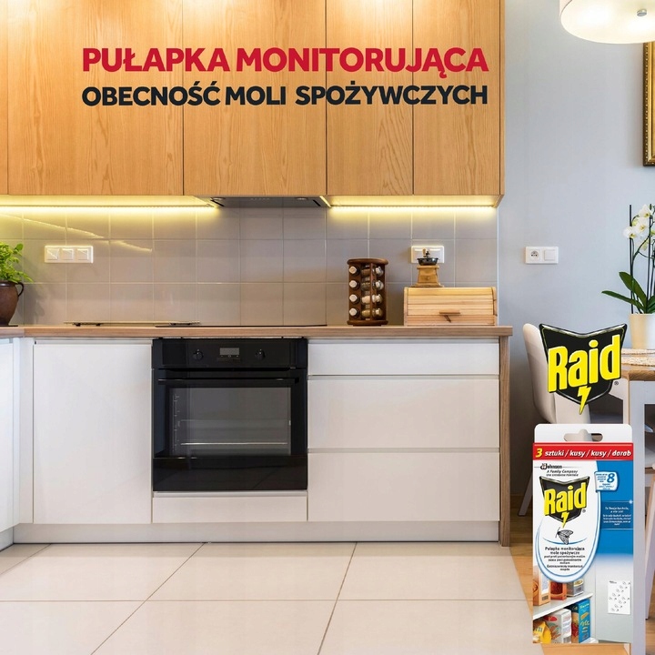 Raid® Trap для контролю наявності харчової молі молі містить феромон, який приваблює особин чоловічої статі, і таким чином дозволяє раннє виявлення присутності та інтенсивності харчової молі. Виявлена кількість молі (вона прилипає до липкої нігтьової пластини) дозволить прийняти рішення про застосування відповідного біоцидного препарату для боротьби з нею. Діє до 8 тижнів.