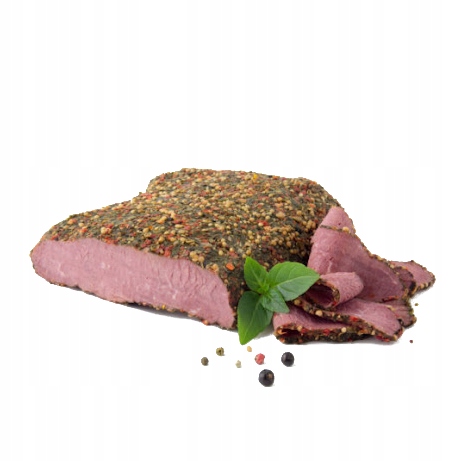 Оригінальна копчена пастрамі зі свинячого окосту з посипкою спеціями. Копчений на дровах вільхи з додаванням дуба. Завдяки такому способу копчення пастрамі має відмінний аромат і смак. Він також соковитий, але добре копчений.