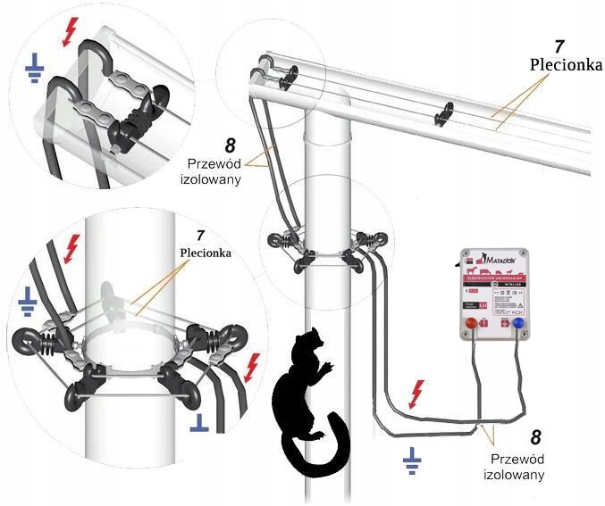 Оскільки електричні кабелі встановлені на жолобах і куниця, яка може їх торкнутися, не має зв’язку із землею, заземлюючий контакт джерела живлення не потрібно підключати до землі.