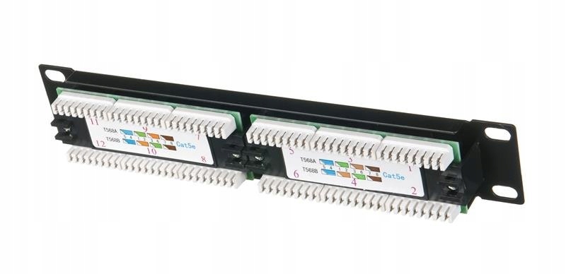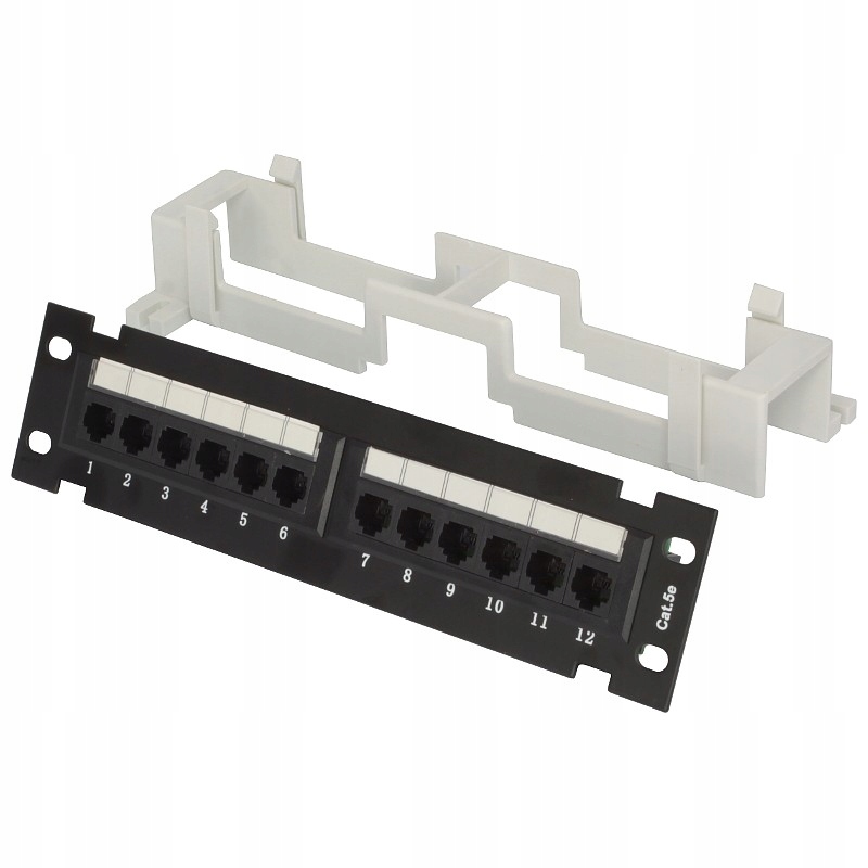 12-портова неекранована патч-панель, категорія 5e, висота 1,5U, призначена для встановлення в 10-дюймових стійках. Призначена для роботи в ІКТ-установках, які не піддаються електромагнітним перешкодам.
