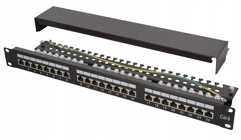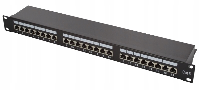 24-портова екранована патч-панель категорії 6 висотою 1U, призначена для встановлення в 19-дюймових стійках. Призначена для роботи в ІКТ-установках, які піддаються електромагнітним перешкодам. Інтегрований кабель полиця дозволяє зручно розташовувати та кріпити кабелі за допомогою самозамикаючих стяжок і зменшує навантаження на пучки кабелів.