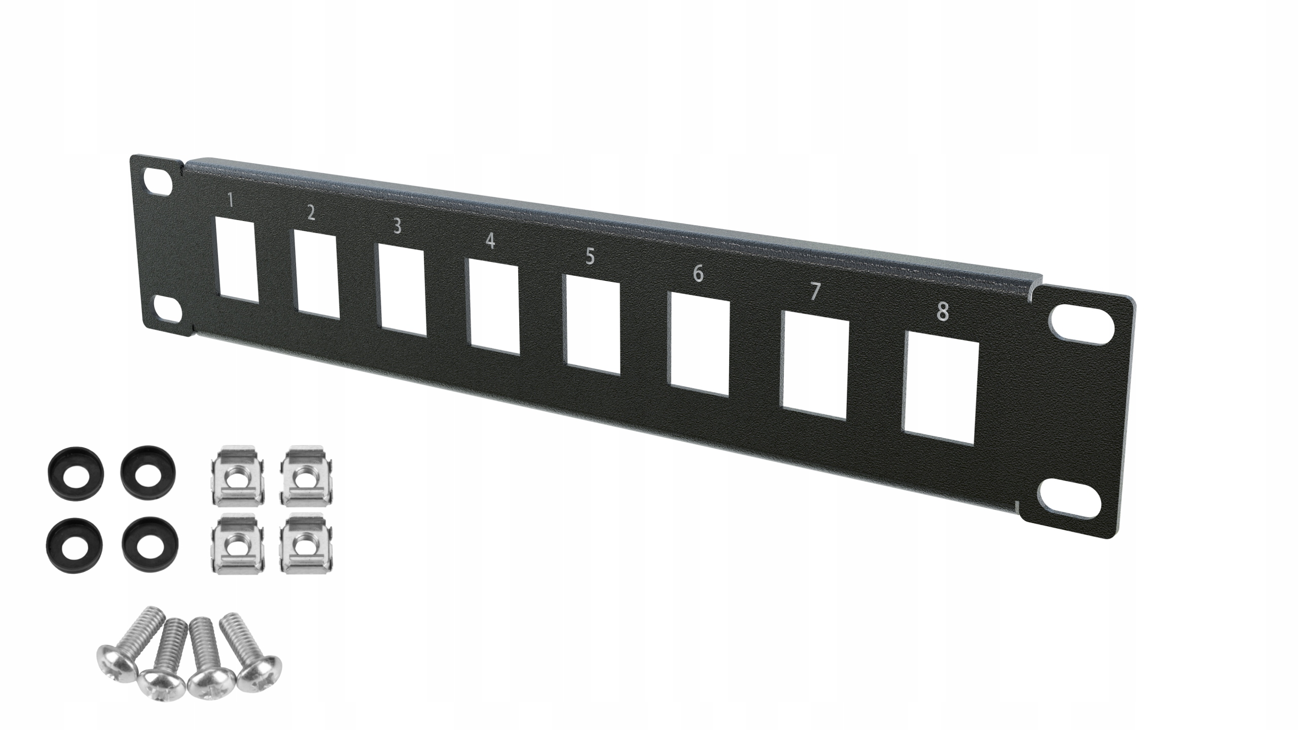 Патч-панель RACK Standard 10" 1U чорного кольору з 8 місцями для модулів Keystone ідеально підходить для невеликих серверних кімнат і місць, де потрібна стиснена, але функціональна кабельна організація.