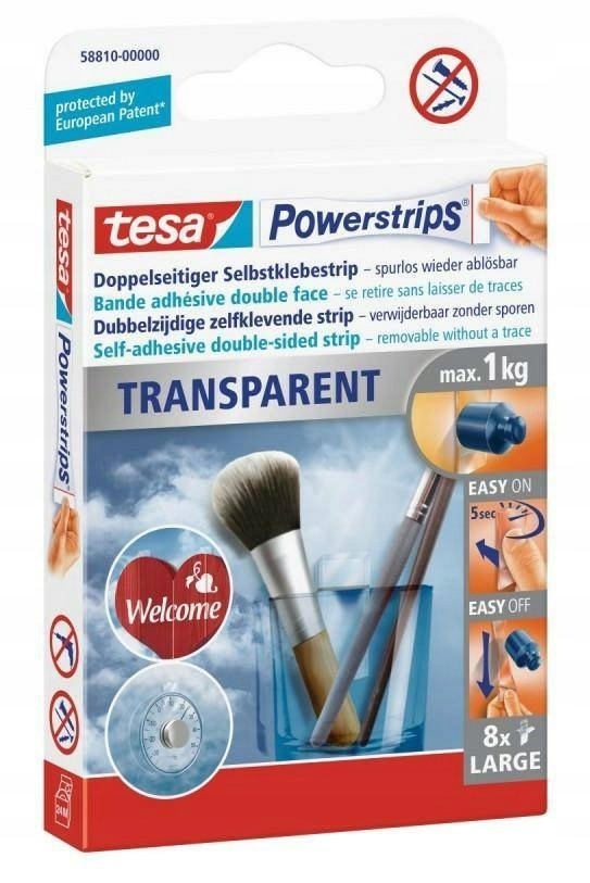 Самоклеючі пластирі tesa® POWERSRIPS TRANSPARENT - незамінний спосіб кріплення різноманітних видів декорацій та предметів вагою до 1 кг. Нашивки прозорі і майже непомітні, тому ідеально підходять для підвішування предметів на скло або дзеркало. Патчі помірно стійкі до УФ-випромінювання. Після видалення вони не залишають слідів.
