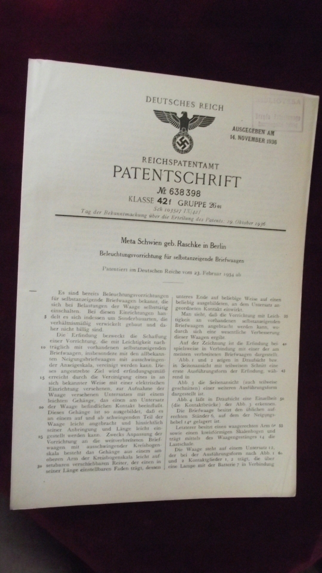 Patentschrift deutsches reich 1936