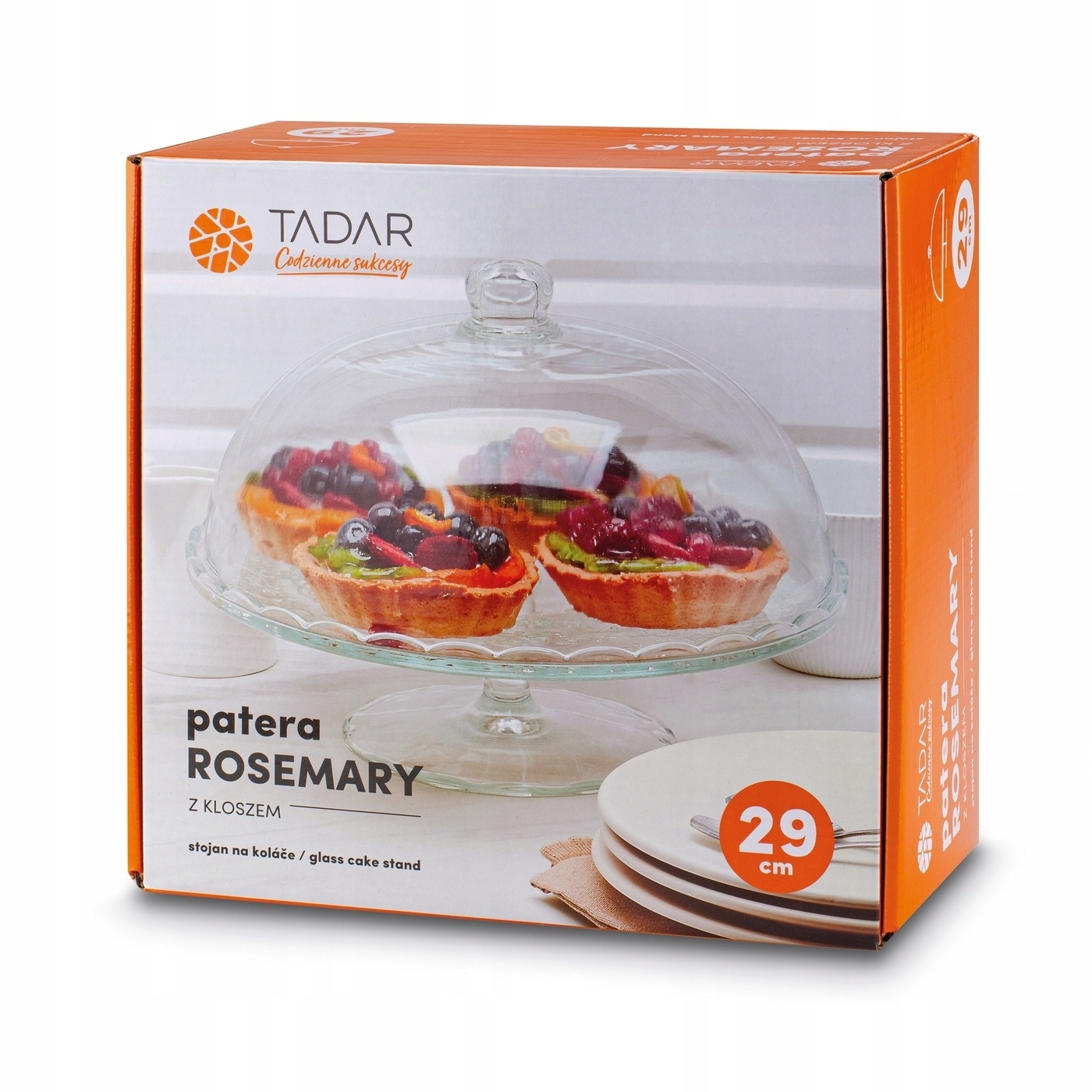 Скляний торт Patera та Fruit Tadar Rosmary 29 см - це ідеальне доповнення до десерту та наявного столу. Продукт був виготовлений з міцного скла. У версії є нога, що гарантує стабільну обстановку. Це ваш один рівень способу до апетитного десерту. Він навіть підійде до великого круглого торта. Щодня і в різних випадках ви також будете обслуговувати іншу випічку та навіть фрукти. Ви можете їх добре захистити від сушіння, забруднення та комах, наприклад Організувавши зустріч у саду. Скляний світильник допоможе вам у цьому. Весь має просту форму, і це полегшує ретельний догляд за плачками на нозі Розмарі.
