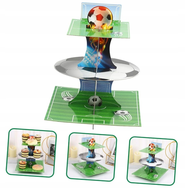 Створіть незабутню атмосферу на вашій вечірці завдяки цьому підставці для тортів та кексів у футбольному стилі! Ця 3-рівна підставка не тільки додасть спортивному шарму кожній події, але й ефективно відображатиме солодкі частування. Простий у встановленні, він ідеально підходить для дня народження та вечірок любителів футболу.
