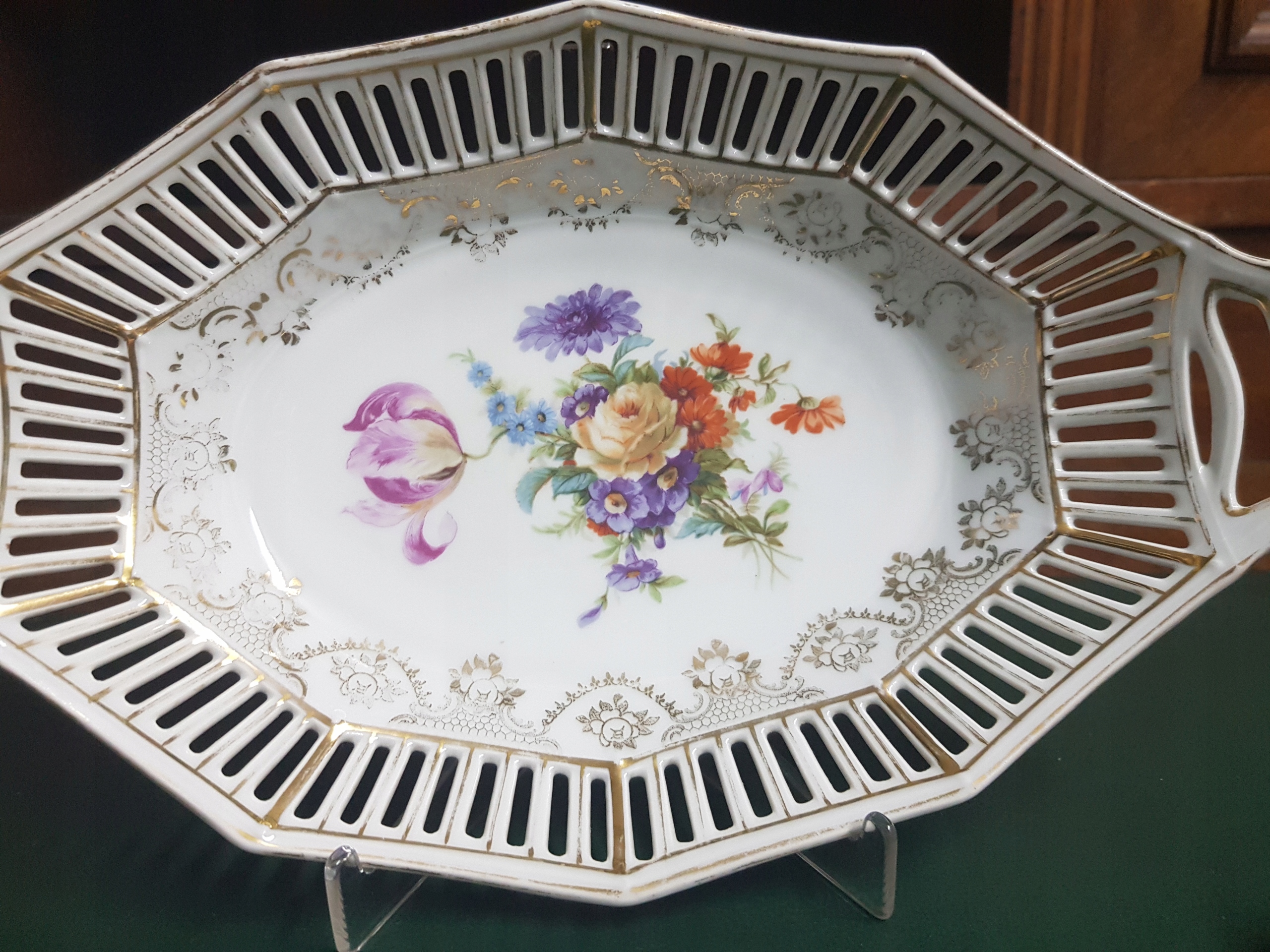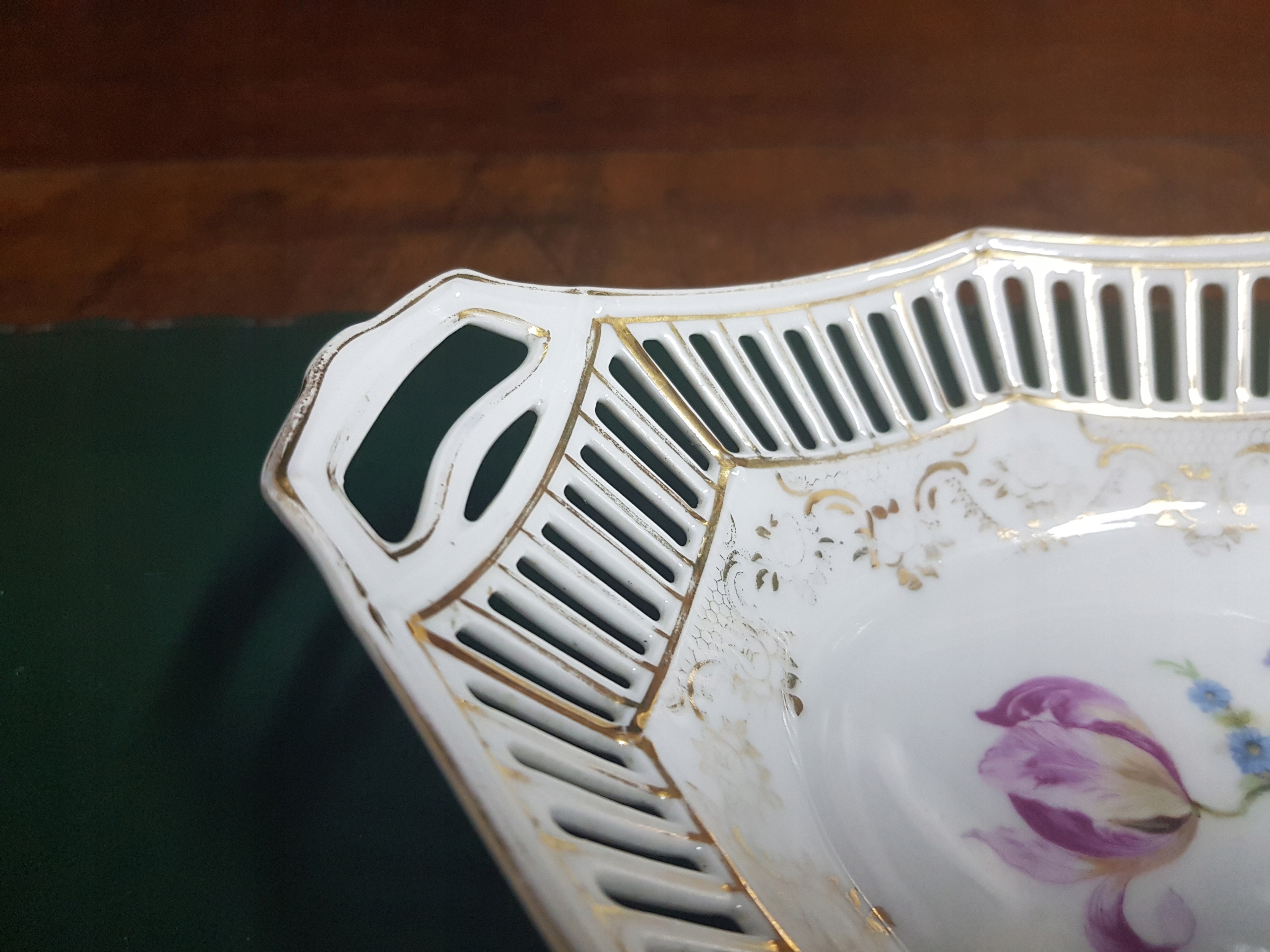 Предмет аукціону - підставка для торта,кошик Шумана.Оздоблено квітковим мотивом.Потертості до позолоти по краю.(фото)