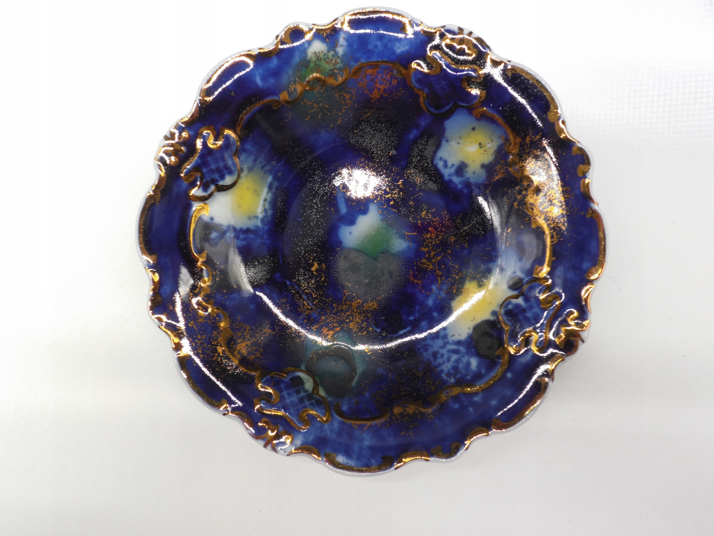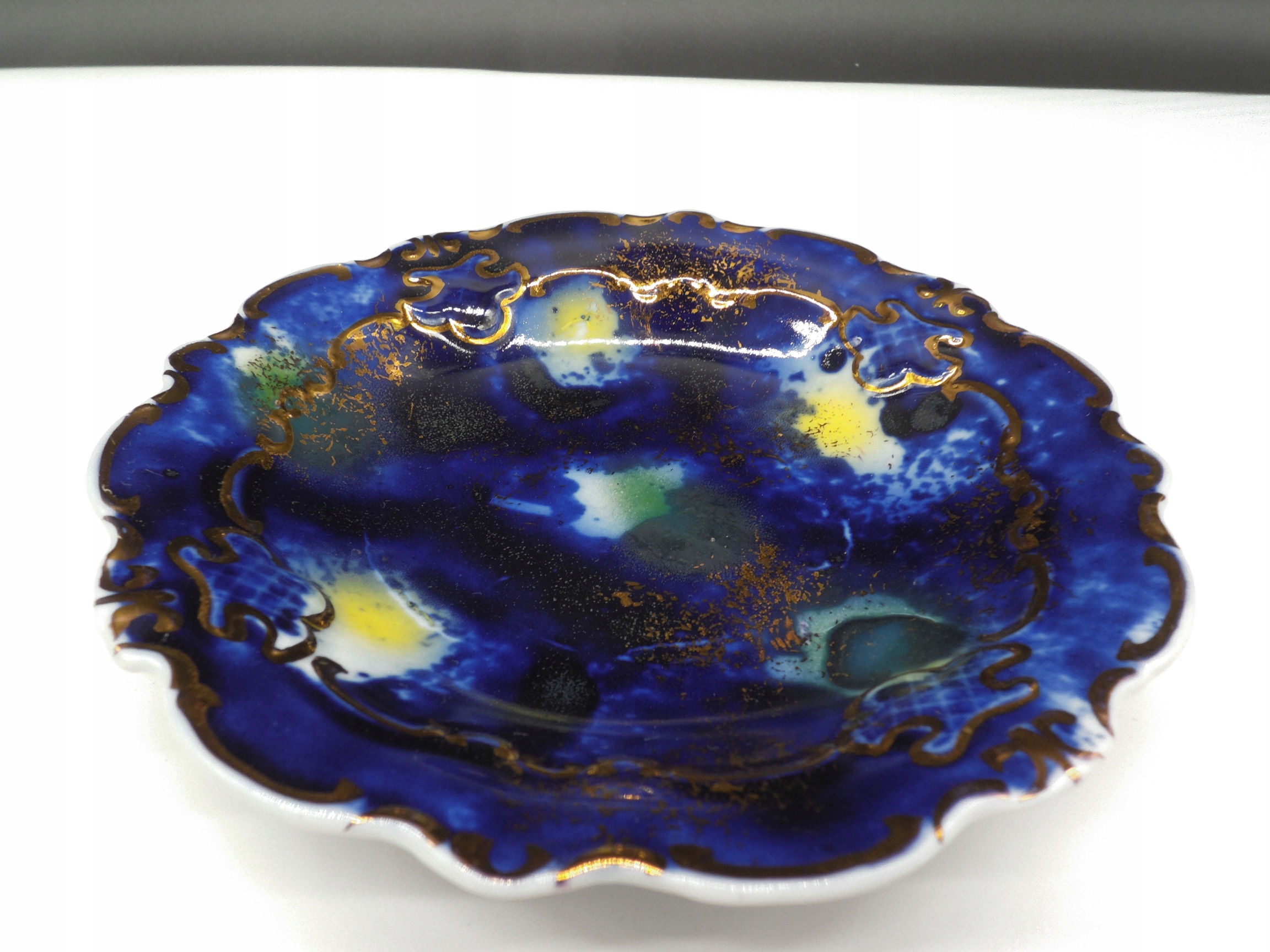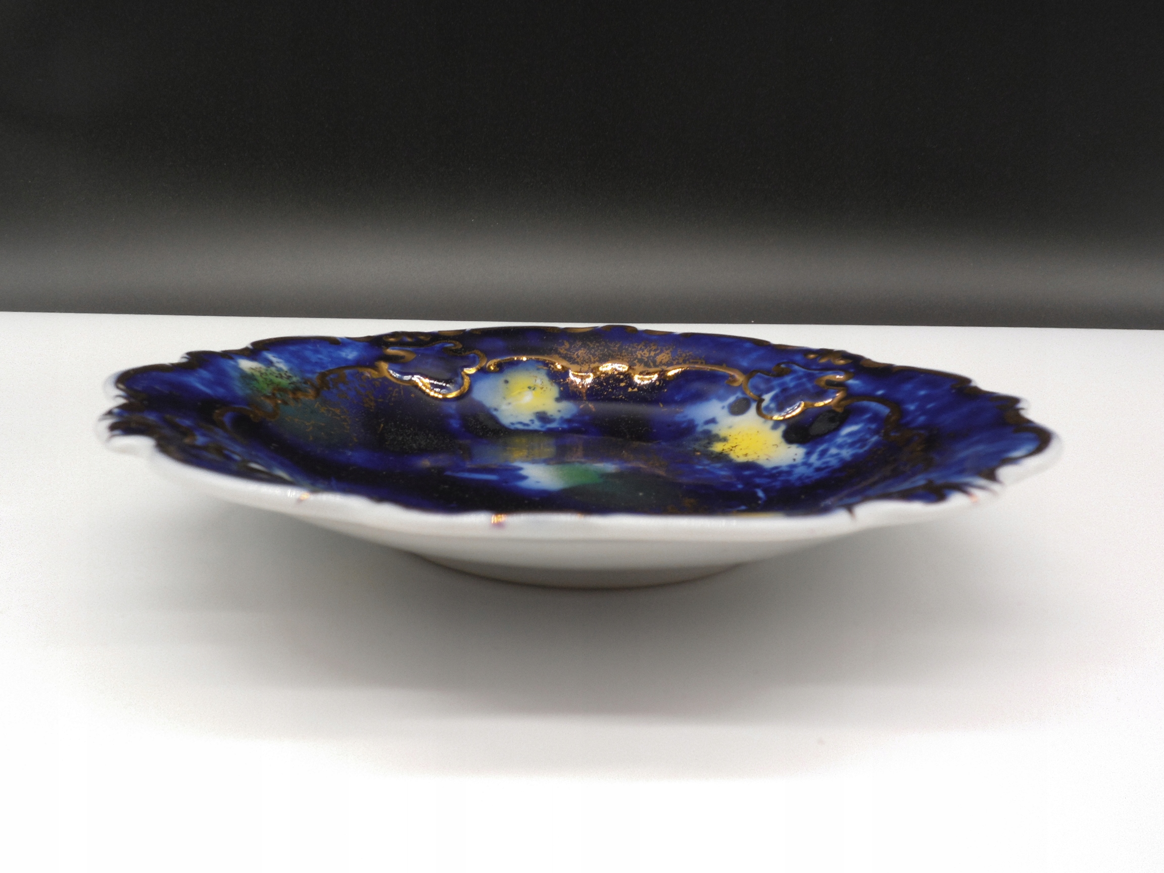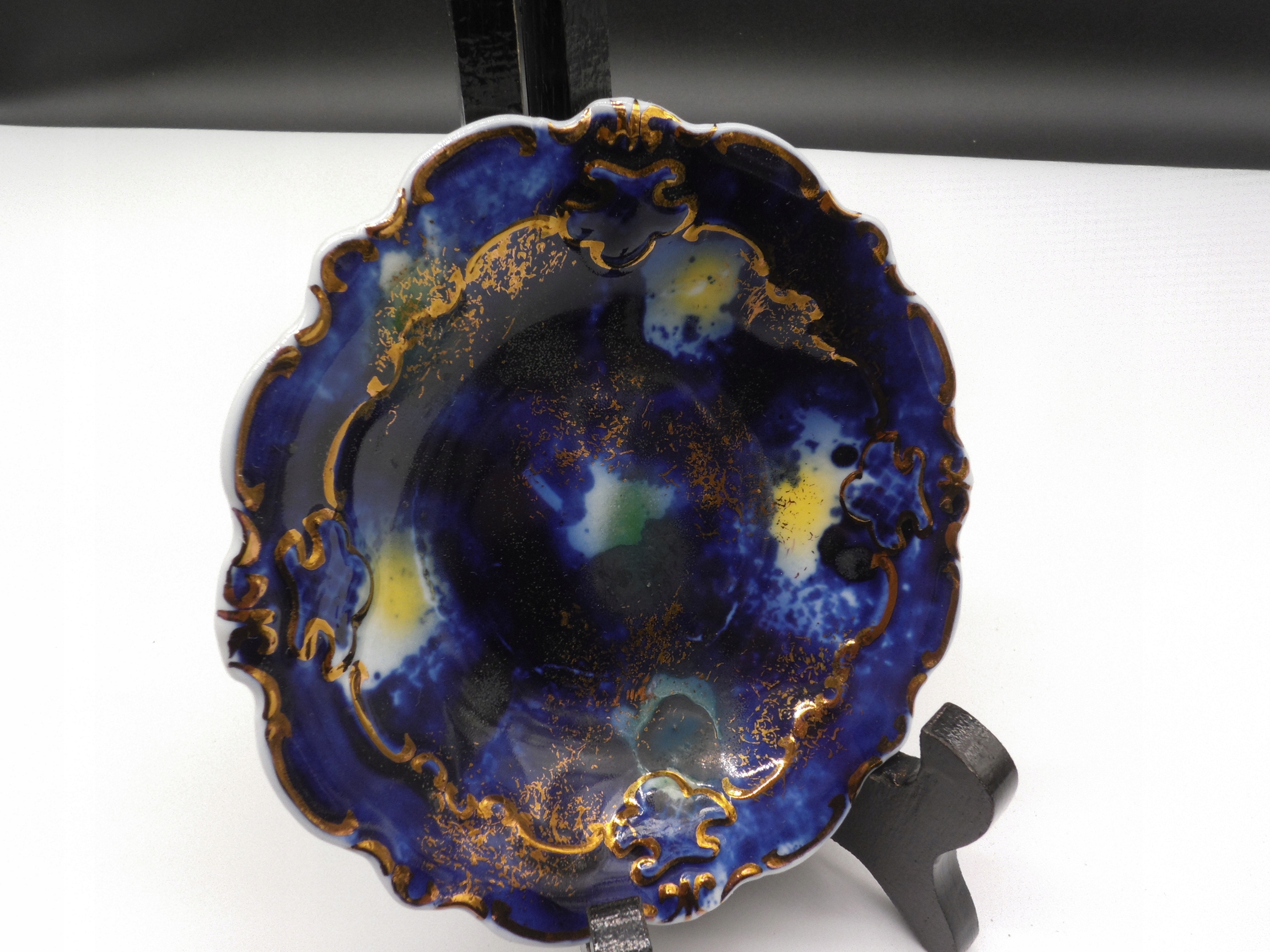 Стара порцелянова підставка для торта, підпис - Валлендорф, Німеччина, 1970-ті роки, красивий кобальтово-блакитний розпис, прикрашений позолоченими рельєфами, розпис так званим зоряним пилом