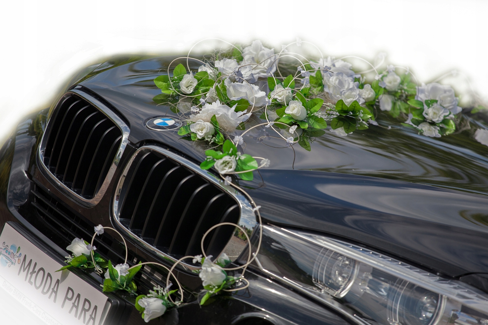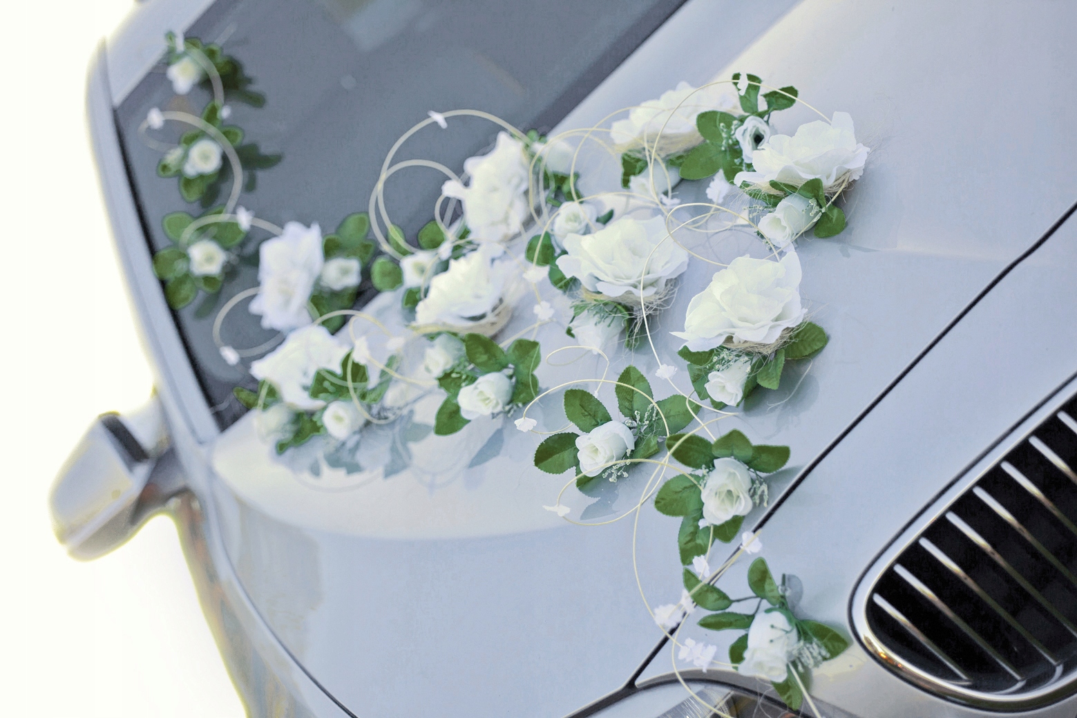 Набір для декорування автомобіля PATI. Композиція з тридцяти шести штучних троянд кремового кольору. Маленькі білі квіти, розміщені на декоративних ротангових вінках, надають прикрасі особливого характеру.