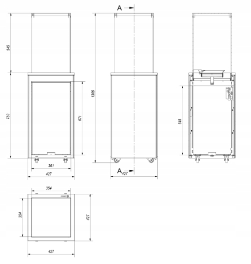 Корпус і колір: ; нижня частина обігрівача покрита чорною сталлю з порошковим покриттям Розміри: ; ширина версії MINI: 42,7 см, глибина : 42,7 см, висота: 136,60 см Керування: ;ручне