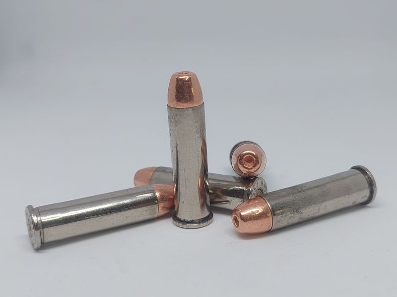 Пропоную декоративні патрони калібру .357 Magnum у срібній гільзі з кулею з порожнистим наконечником.